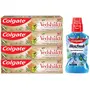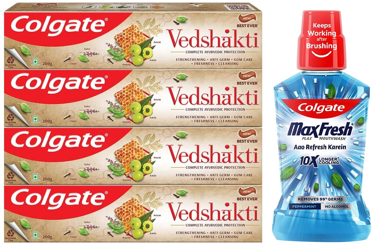 Colgate Swarna Vedshakti Ayurvedic Gum CareToothpaste With Anti-Germ Properties For Whole Mouth Protection - 4 x 200gmA Clean Mouth means a Healthy You. Your mouth is a host to germs. These germs can enter your body and increase risk of serious diseases such as Diabetes Heart Attack Respiratory Problems Gastrointestinal Diseases Alzheimer's. Colgate Swarna Vedshakti fights germs in the mouth itself and helps stop germs from entering the body. Its unique formula has been created with 5 Ayurvedic ingredients: Neem known to have gum care benefits Clove known for strengthening Amla known for its anti-ger properties Tulsi for freshness & Honey for gum massage. Colgate is India's Most Trusted oral care brand and is certified by Indian Dental Association. This toothpaste is 100% vegetarian and Gluten free. This toothpaste is made in India in our manufacturing unit that is awarded with True Zero Waste Platinum Certification.Colgate Plax Pepper Mint Mouthwash 0% Alcohol - 500 mlColgate Plax Peppermint Fresh mouthwash removes over 99% of germs that cause bad breath and cavities giving you a fresher and cleaner mouth than brushing alone. It has an extra refreshing peppermint flavour.This mouthwash contains no alcohol (non-alcoholic) hence does not cause any burning sensation when you use it. Yet it removes 99% germs instantly. You will experience an instant blast of freshness and 10X longer cooling sensation compared to brushing alone. This mouthwash gives you 24/7 control over bad breath with regular use. How to use: Fill the cap to its line (20ml). Rinse mouth with mouth wash thoroughly for 30 seconds gargle and expel. Do not swallow. This mouth wash can be used by both men and women When to use: After brushing An effective mouth freshner for your post meal needs. Colgate is India's most trusted oral care brand. As a trusted partner we are committed to doing business with integrity and respect for all people and the world around you. Colgate offers quality oral care products including toothpastes and toothbrushesas well as expert dental health information.