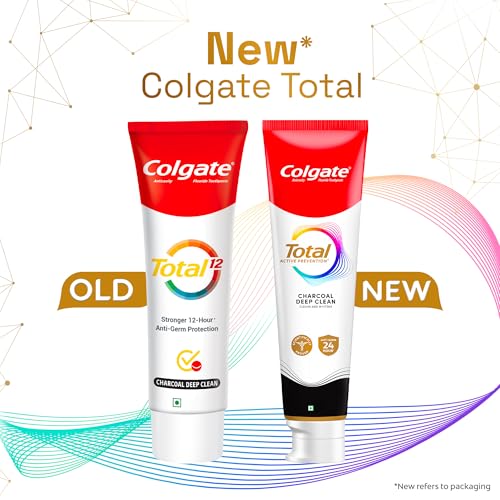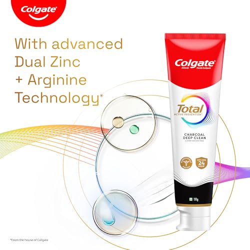 Only 20% of the germs in your mouth are on your teeth the rest 80% are on gums tongue and cheeks. Colgate Total Charcoal Deep Clean is an antibacterial toothpaste with dual Zinc arginine technology that actively seeks out bacteria and fights germs on teeth tongue cheeks and gums giving you Whole Mouth Clean for 12 hours. It is infused with micro-charcoal particles to provide a deep clean. Colgate Total provides more benefits than before - helping prevent cavities plaque build-up tartar formation gingivitis and sensitivity. It gives you fresh breath protects your enamel and removes stains giving you a healthier whiter smile Colgate is India's Most Trusted oral care brand and is IDA certified. This toothpaste is 100% vegetarian and gluten-free and responsibly made.This toothpaste is made in India in our manufacturing unit that is awarded with True Zero Waste Platinum Certification.