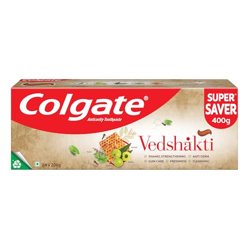 Experience the power of nature with Colgate Vedshakti Toothpaste a unique blend of five potent ingredients: neem clove amla tulsi and honey. Each ingredient is carefully selected for its traditional benefits offering a holistic approach to oral hygiene. Neem provides advanced gum care clove strengthens your teeth amla boosts oral condition with its rich Vitamin C content tulsi refreshes your breath and honey adds a touch of natural sweetness while helping to soothe your gums. This Vedshakti toothpaste offers anti-germ protection and gum care helping to fight germs in your mouth and stop them from entering your body*. Colgate Vedshakti Toothpaste offers strengthening anti-germ protection gum care freshness and cleansing all in one. Its vegetarian gluten-free and certified by the Indian Dental Association ensuring trusted oral care for your family. Crafted with a refreshing formula this neem toothpaste 200g ensures freshness and strong teeth. Manufactured in India this Colgate toothpaste supports environmental responsibility with True Zero Waste Platinum Certification. Whether you're looking for comprehensive gum care anti-germ protection or simply a toothpaste that offers a refreshing experience with the power of nature Colgate Vedshakti is your ideal choice. (*with twice daily brushing)