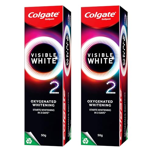 Colgate Visible White O2 Teeth Whitening Toothpaste (50g) for noticeably whiter teeth starting in 3 days. Peppermint Sparkle with Active Technology Enamel Safe Teeth Whitening (Pack of 2)