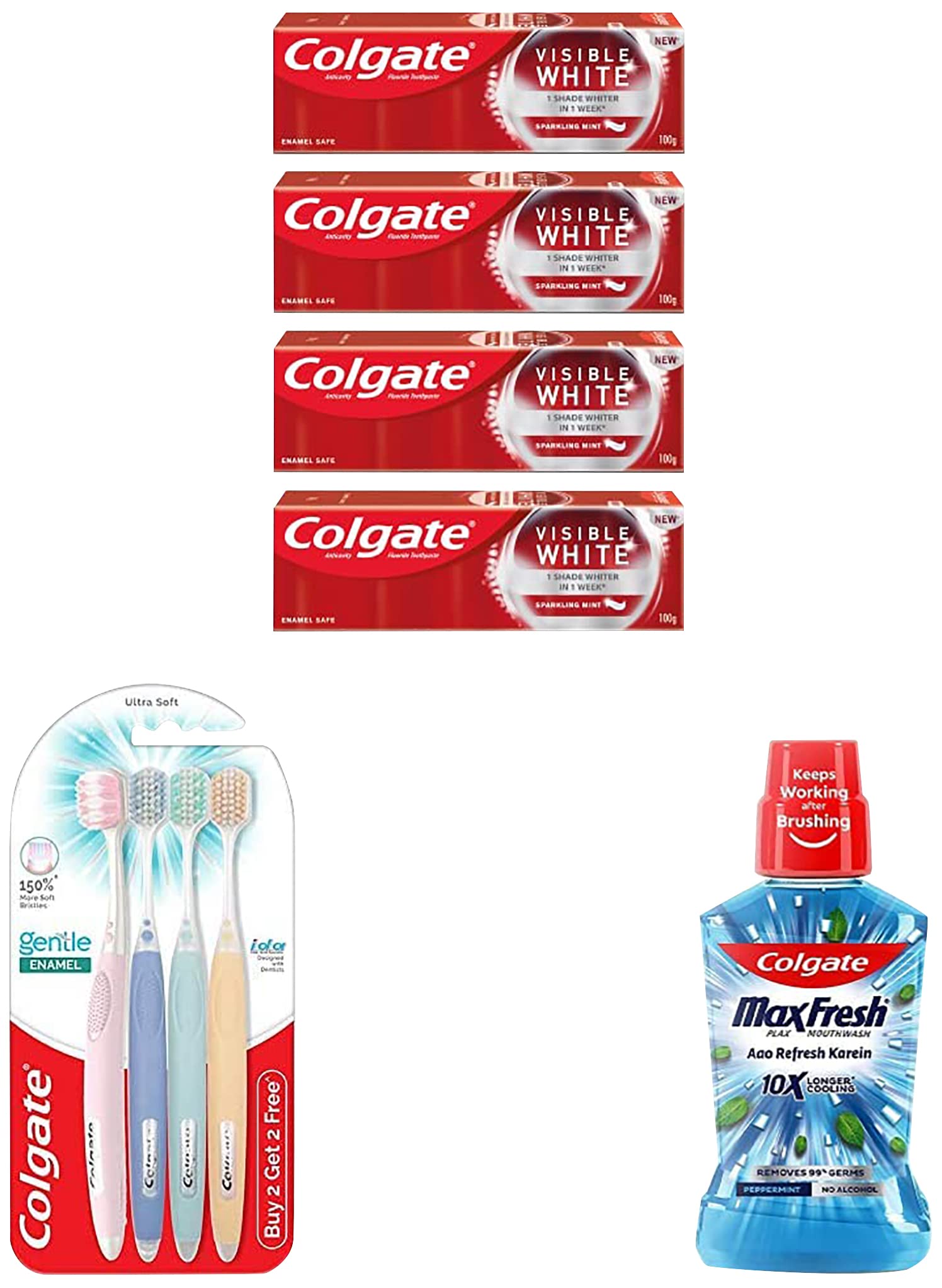 Colgate Visible White Teeth Whitening Toothpaste Pack of 400g(100g X 4) with Whitening Accelerators for Tobacco Stain Removal  Colgate Toothpaste with Minty Flavor for Everyday Fresh BreathComplete your look with the only beauty essential you need: a dazzling white smile! Our Visible White toothpaste helps you get one shade whiter teeth in one week when used as directed on the pack. Enjoy a healthier and whiter smile. Our Visible White toothpaste is infused with whitening accelerators like Silica and Pyrophosphate which helps in removing tobacco stains & teeth whitening by gently exfoliating stains and polishing the surface of your teeth for a beautiful white smile Colgate Visible White toothpaste a teeth whitening product which comes with multiple benefits helping fight cavities and plaque build-up. Our Colgate toothpaste has a refreshing minty flavor that gives you fresher breath as well Colgate toothpaste is always 100% vegetarian and gluten-free. We care about our environment Colgate India is the nation's first to earn TRUE Zero Waste Platinum certification for all its four manufacturing sites in India from Green Business Certification Inc. (GBCI). This toothpaste is made in India with the highest quality standardsColgate Gentle Enamel Ultra Soft Bristles Manual Toothbrush for adults 4 Pcs (Buy2 Get 2) Soft Bristles for Enamel CareMulticolorToothbrushColgate Plax Pepper Mint Mouthwash 0% Alcohol - 500 mlColgate Plax Peppermint Fresh mouthwash removes over 99% of germs that cause bad breath and cavities giving you a fresher and cleaner mouth than brushing alone. It has an extra refreshing peppermint flavour.This mouthwash contains no alcohol (non-alcoholic) hence does not cause any burning sensation when you use it. Yet it removes 99% germs instantly. You will experience an instant blast of freshness and 10X longer cooling sensation compared to brushing alone. This mouthwash gives you 24/7 control over bad breath with regular use. How to use: Fill the cap to its line (20ml). Rinse mouth with mouth wash thoroughly for 30 seconds gargle and expel. Do not swallow. This mouth wash can be used by both men and women When to use: After brushing An effective mouth freshner for your post meal needs. Colgate is India's most trusted oral care brand. As a trusted partner we are committed to doing business with integrity and respect for all people and the world around you. Colgate offers quality oral care products including toothpastes and toothbrushesas well as expert dental health information.