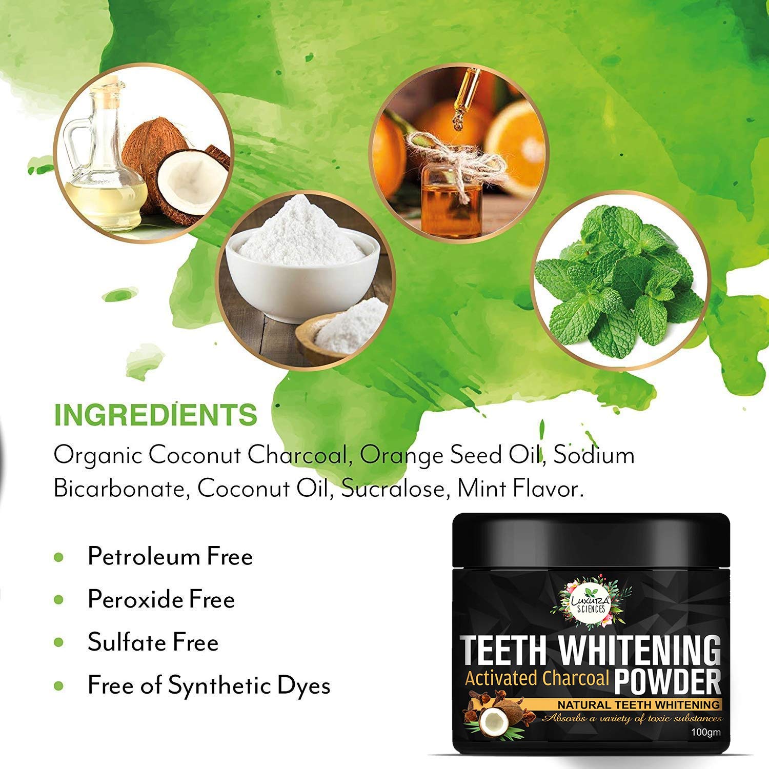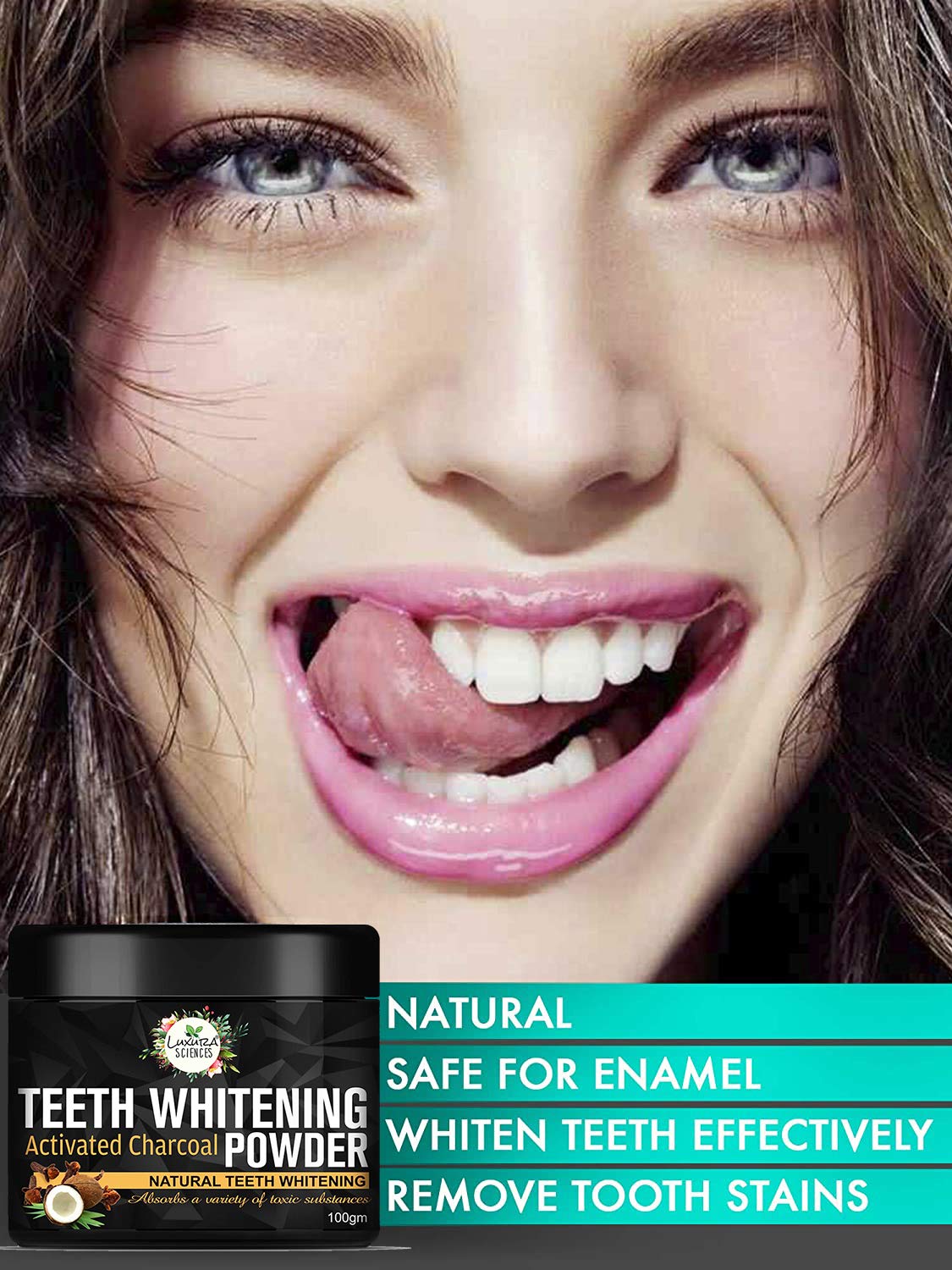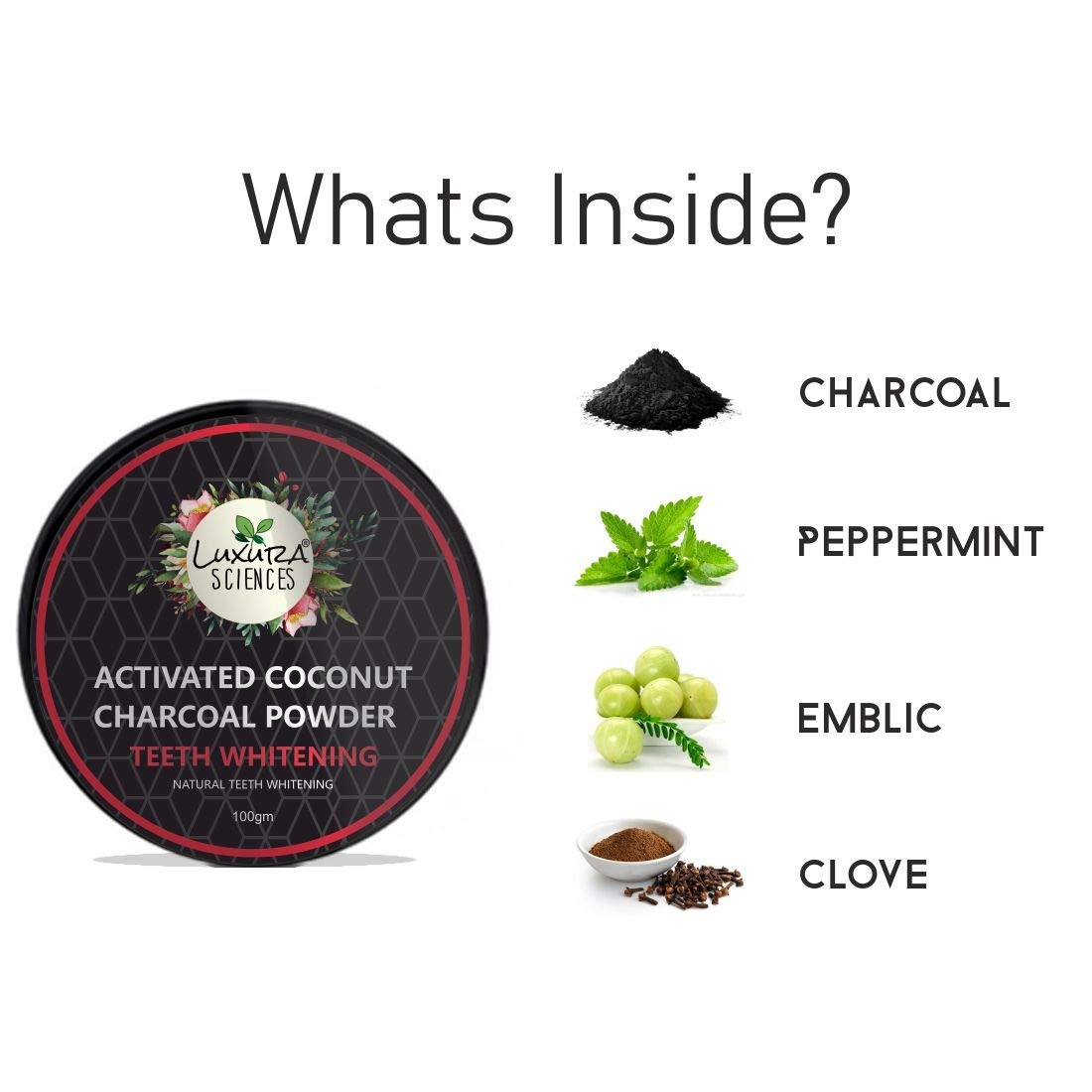 Luxura Sciences Carbon White Activated Charcoal Powder Teeth Whitening Powder with Clove Mint Extracts. 100 Gms. Refreshing Anti-Inflammatory.