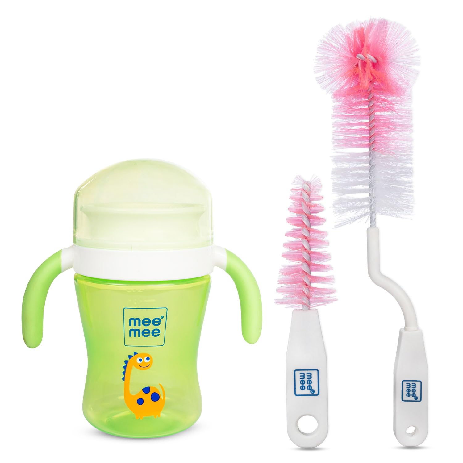 Mee Mee 2 in 1 Convertible Sipper Cup with Soft Spout & Straw - 240ml (Green) & 360 Movable Bottle Cleaning Brush (Pink) Combo the ultimate solution for your child's hydration and hygiene needs. The 240ml convertible sipper cup is designed to grow with your child featuring a soft spout for beginners and a straw for more advanced drinkers. Made from high-quality BPA-free materials it ensures safety and durability. The sipper cup's ergonomic design and easy-grip handles make it simple for little hands to hold promoting independent drinking. The leak-proof cap prevents spills ensuring mess-free use. Paired with this the 360 Movable Bottle Cleaning Brush in Pink offers efficient and thorough cleaning. Its flexible bristles and rotating handle reach every corner of the cup and straw ensuring no residue is left behind. This combo not only supports your child's development but also makes cleaning and maintenance hassle-free for parents.