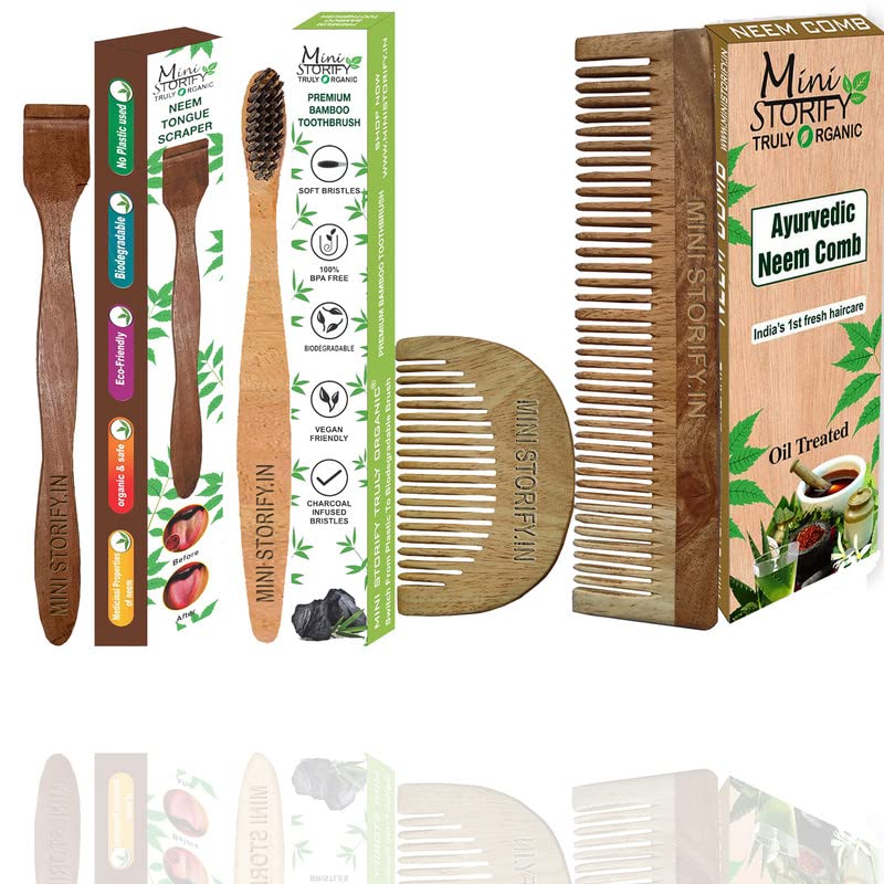 Neem is a recognized and germicide; no insects or bacteria ever come close to neem products.These handcrafted combs you can get an excellent stimulating effect as the comb teeth glide over your scalp. Gently press against the scalp and comb as usual. It is a good practice to comb more often, as this not only stimulates the scalp cells but keeps it disinfected. Made up of 100% ayurvedic neem wood.2-Bamboo Toothbrush with charcoal bristles is completely natural, destroy microorganisms to fight dental cavities.