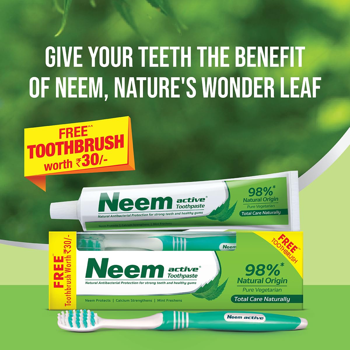 Neem Nature’s Wonder Leaf: Neem which has natural antibacterial properties helps prevent and heal gum disease prevents cavities and eliminates bacteria that cause cavities and inflammation of the gums.Neem Active Toothpaste- 98% Natural Origin:Neem Active Toothpaste is made with 98% natural & nature derived ingredients ensuring a safer and more eco-friendly choice for your oral care routine as well as for the environment. It is free from harsh chemicals making it suitable for those with sensitive teeth or gums.The 100% vegetarian formula of Neem Active Toothpaste aligns with ethical choices for those who prioritize cruelty-free products.Why choose Neem Active Toothpaste?Neem Active Toothpaste is an oral care solution that brings together the power of nature and the goodness of neem. Not only does Neem Toothpaste help fight bacteria but it also promotes healthy gums. Its gentle yet effective formula helps reduce inflammation and soothes gum sensitivity leaving your gums feeling refreshed and revitalized. Say goodbye to harmful bacteria and hello to healthier teeth and gums. Embrace nature's healing properties and enjoy a bright smile with Neem Toothpaste today!Freshness of breath: Apart from the above benefits Mint helps in freshening up your breath.Oral hygiene: Regular brushing with will reduce the deposition of plaque prevent caries and enhance the immune response for overall oral health. Direction to use: First apply just a pea-sized amount of toothpaste. Rather than moving across your teeth you should brush with small circular motions. Hold your brush at a 45° angle while brushing the front of your teeth. Clean the insides of your teeth by opening wide and angling your toothbrush toward the gum line.