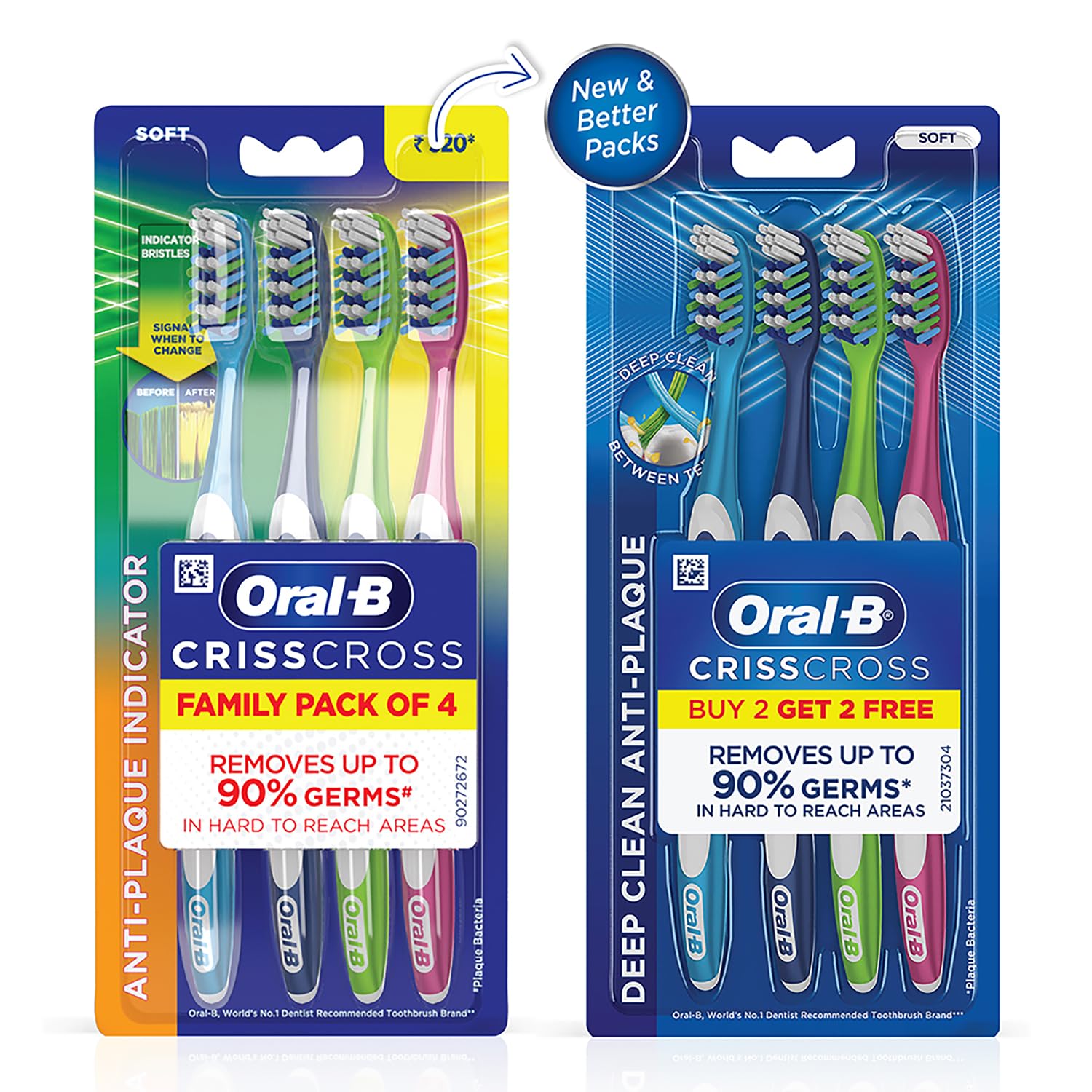 Oral B the world's #1 dentist-recommended brand brings you revolutionary brushing solutions with best-in-class technology with proven results for a healthier Cleaner smile. Oral B Crisscross Deep Clean Soft Toothbrush has uniquely angled Criss Cross bristles positioned at 16 degrees in opposing directions to effectively lift and remove 90% of plaque from the deepest corners of your mouth. Integrated tongue Cleaner for maintaining fresh breath and a cleaner mouth. It is Soft on delicate gums and enamel without compromising an effective clean. End-rounded bristles combined with a powerful tip designed for precise and gentle Cleaning. Designed with an ergonomic handle and cushioned grip for comfortable and controlled brushing ensuring ease of use and precision. Experience a superior Clean and healthier gums with Oral B Crisscross Deep Clean Soft Toothbrush.