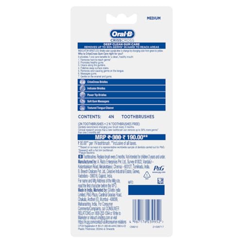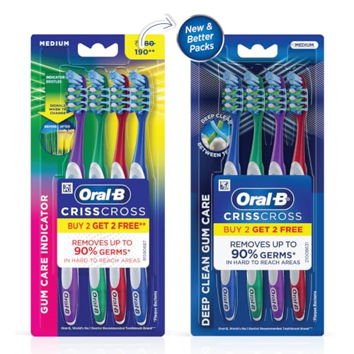 Oral B the world's #1 dentist-recommended brand brings you revolutionary brushing solutions with best-in-class technology with proven results for a healthier Cleaner smile. Oral B Crisscross Gum Care Deep Clean Medium Toothbrush has uniquely angled Criss Cross bristles positioned at 16 degrees in opposing directions to effectively lift and remove 90% of plaque from the deepest corners of your mouth. Integrated tongue Cleaner for maintaining fresh breath and a cleaner mouth. Equipped with a gentle gum massager that stimulates gums for improved blood flow and overall gum health. End-rounded bristles combined with a powerful tip designed for precise and gentle Cleaning. Designed with an ergonomic handle and cushioned grip for comfortable and controlled brushing ensuring ease of use and precision. Experience a superior Clean and healthier gums with Oral B Crisscross Gum Care Deep Clean Medium Toothbrush.