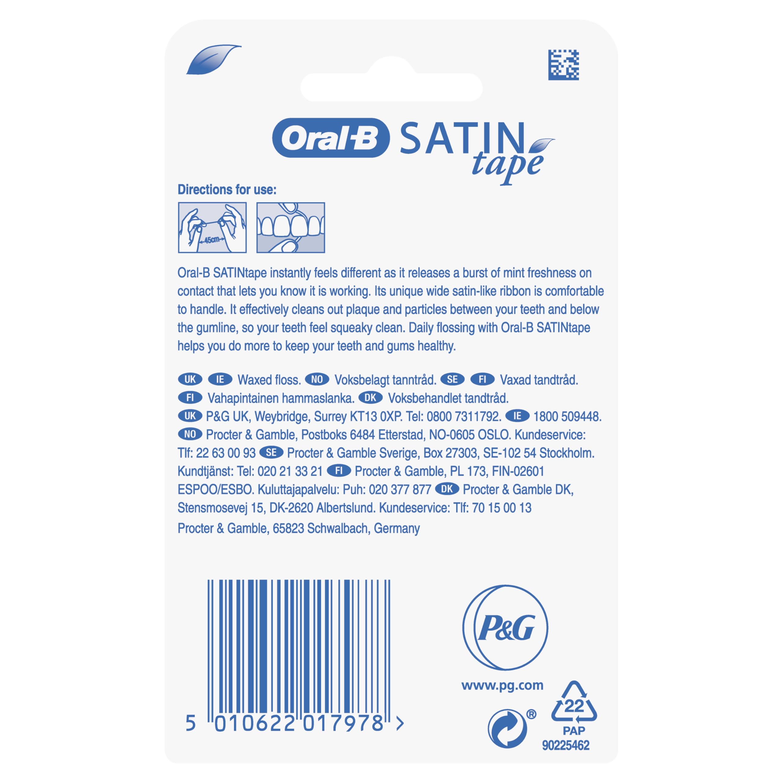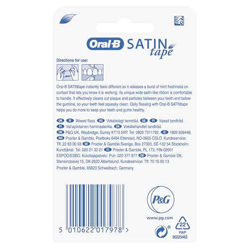 Oral-B Satin Dental Floss 25 m Plaque Remover for Teeth Fresh Clean Feeling Wide Tape with a Satin-Like Texture Comfort Grip Mint