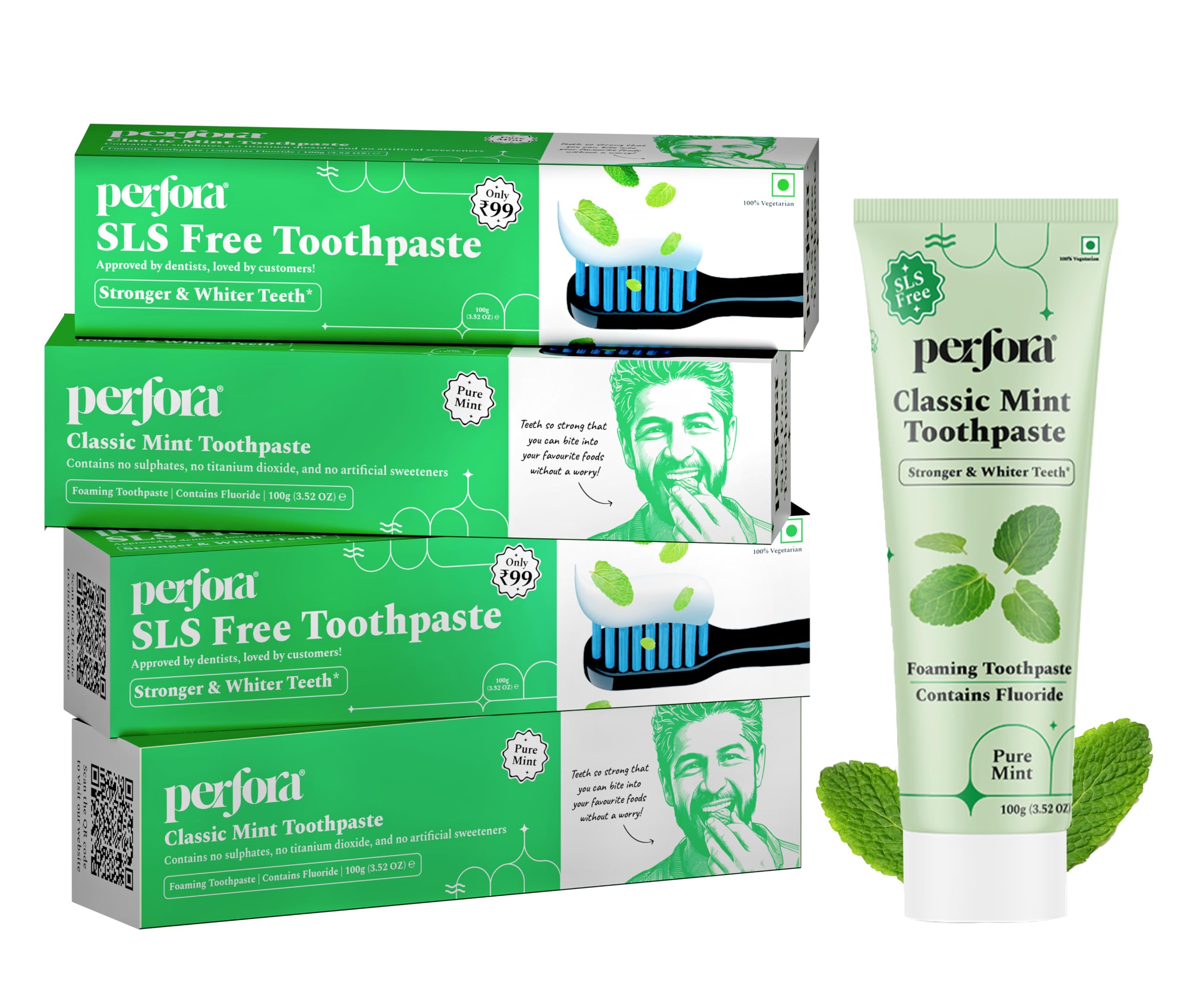 HomeHealth & PersonalPersonal CareOral CarePerfora Classic Mint Toothpaste - (100g x 4) | Enamel Safe Teeth Whitening Toothpaste for Men & Women | For Strong & White Teeth | SLS Titanium Dioxide & Sodium Saccharin Free | Pack Of 4