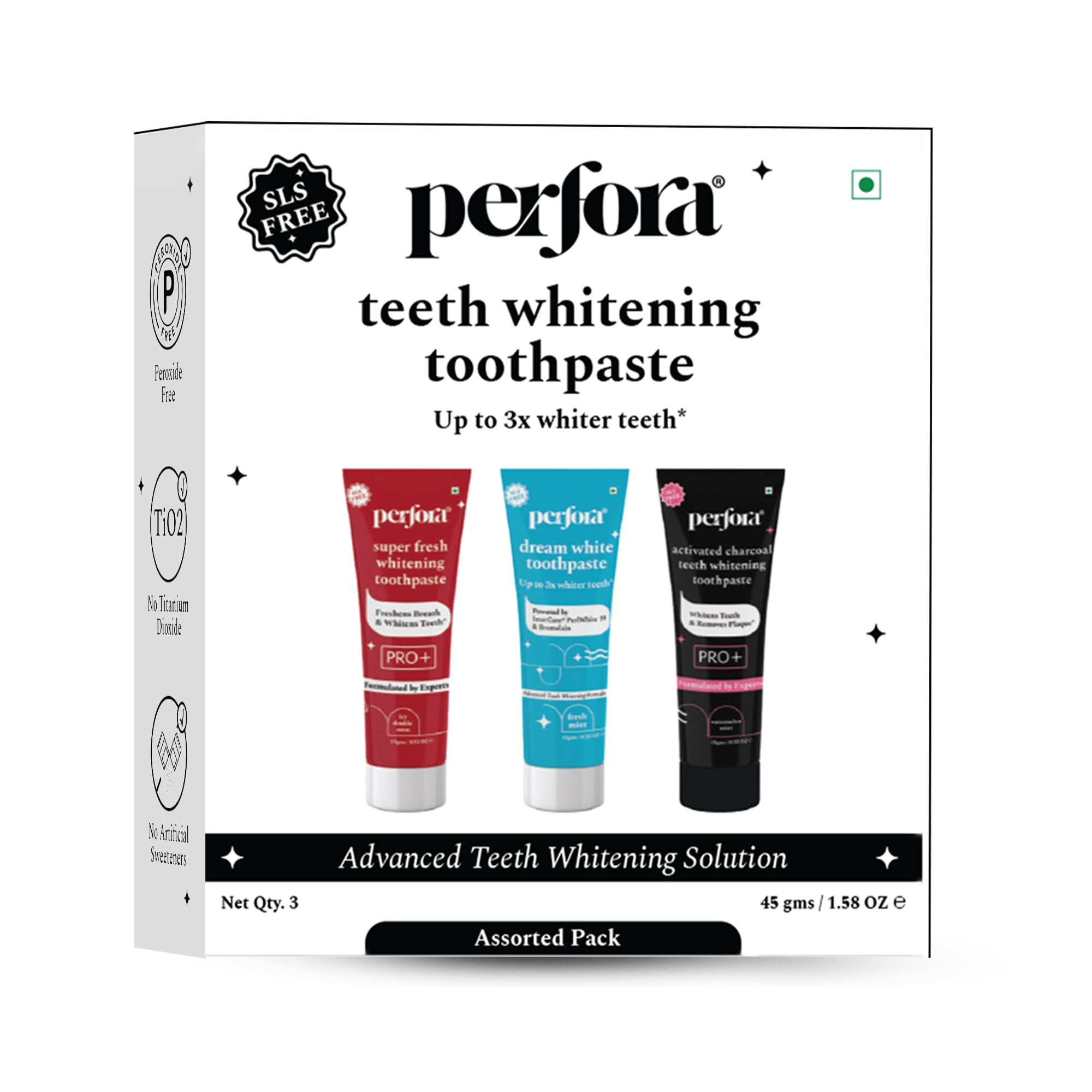 Perfora Teeth Whitening Paste Combo Pack- Enamel Safe Teeth Whitening Toothpaste for Men & Women | Super Fresh Charcoal & Dream White - SLS & Fluroide Free Toothpaste (45 g Pack of 3)