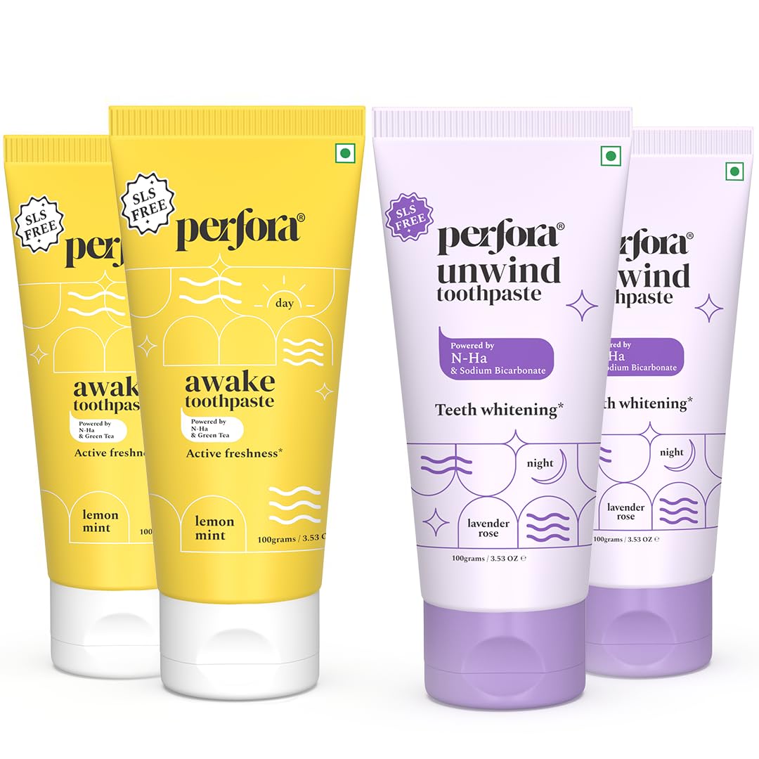 Perfora The Daily Routine Awake & Unwind Toothpaste | Active Freshness Cavity Prevention & Teeth Whitening | SLS & Fluoride Free Toothpastes With N-Ha For Teeth Remineralisation & Oral Care | Set of 4