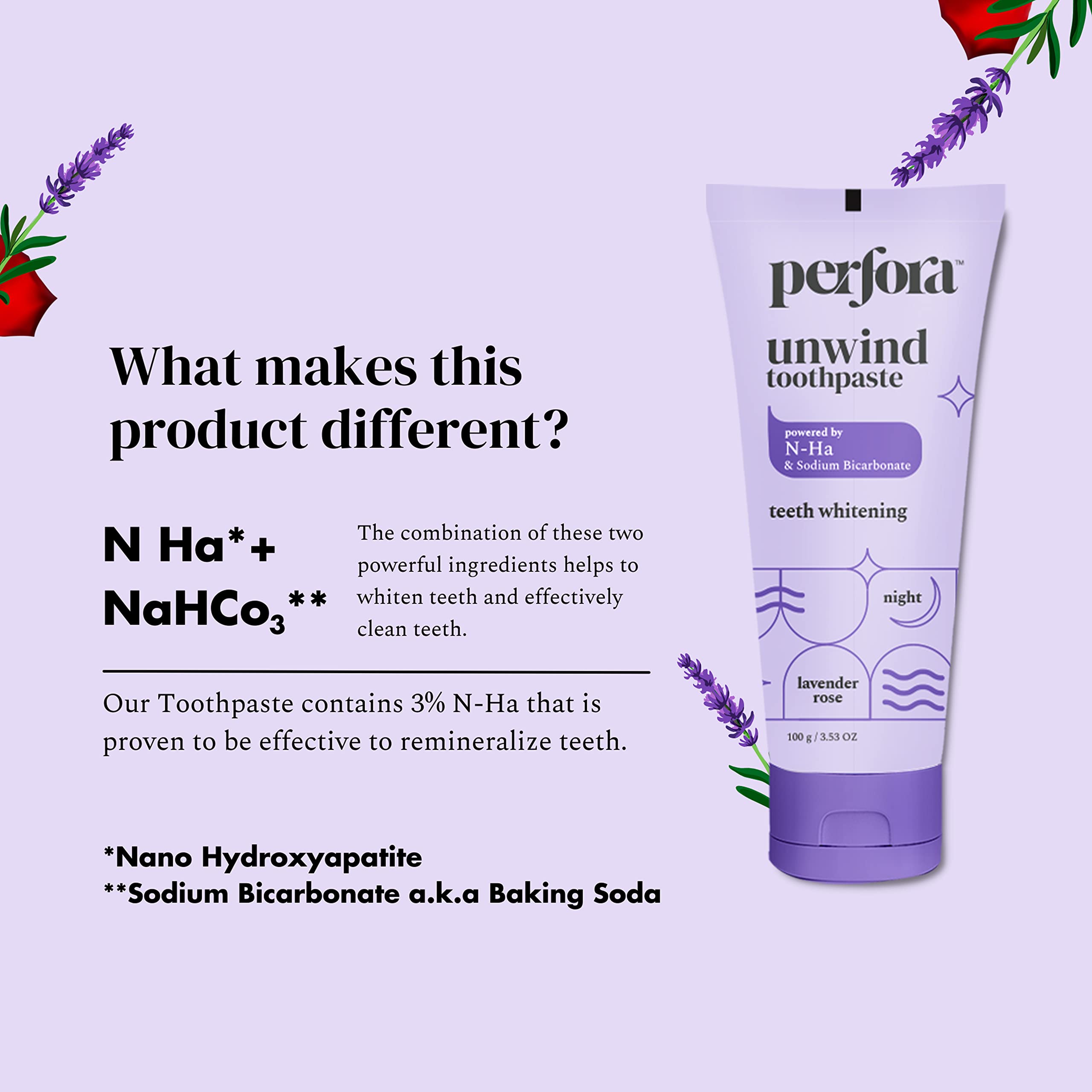 Perfora introduces a range of day and night toothpastes powered with Nano Hydroxyapatite our cavity prevention toothpaste repairs your enamel and provides an extra layer of armour against plaque tartar and other common dental worries. Our whitening and soothing toothpaste provides a remineralising effect to whiten and brighten your teeth while also providing greater protection to sensitive teeth. Perfect for kids and adults alike! With a citrus mint profile Awake gives a burst of freshness right at the start of the day. With a soothing Lavender Rose Profile Unwind provides a layer of calming protection as you catch your beauty sleep. Awake has a potent combination where vitamin C builds connective tissues for stronger gum health and vitamin E fights bacteria to maintain good oral hygiene. Fortified with powerful extracts like Green Tea Aloe Vera Neem & Holy Basil Awake packs an extra punch of goodness for you and keeps your teeth protected with anti-bacterial goodness for the entire day. Cinnamon Strawberry Baking soda are the perfect ingredients to ensure the best cleaning possible for teeth. Made with a 100% clean ingredients awake has no SLS Parabens Heavy Metals Triclosan Titanium Dioxide Formaldehyde Phosphates SLES MEA DEA TEA Dyes Caustics. There’s absolutely no fear of damage caused by chemical ingredients.. We have nothing to hide and you have nothing to fear!