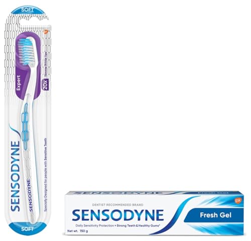 Sensodyne Toothpaste Fresh Gel Sensitive tooth paste for daily sensitivity protection 150 gmWhen the protective layer of teeth (enamel) is worn away or gums recede the dentine underneath becomes exposed. When the exposed dentine comes in contact with hot cold sweet or sour food and drinks it can trigger a sharp short sensation called tooth sensitivity. Sensodyne Fresh Gel is a daily fluoride toothpaste that helps protect against tooth sensitivity while still providing the benefits of a regular paste like strong teeth and health gums. It also has a cool refreshing taste that leaves your mouth feeling fresh and clean. With twice daily brushing you can enjoy your favorite foods and drinks without the worry of sensitive teeth. Sensodyne Fresh Gel tooth paste is available in four packs - 75 gm 150 gm 450 gm (150 gm * 3) and 450 gm (150 gm - Buy 2 Get 1 free) combo pack. Always follow instructions and guidance included on the pack before use.Sensodyne Expert Toothbrush With 20X Slimmer & Soft Bristles 1 Piece (Multicolor)Sensodyne has designed and formulated an entire range of toothbrushes as well as toothpastes to accommodate different needs. Cleaning effectively is important for people especially with sensitive teeth - to help prevent plaque build-up while minimizing further wear and tear that can be caused by excessive brushing. Sensodyne Expert toothbrush is specially designed with experts for gentle yet thorough cleaning of teeth. It is scientifically crafted with cross active and soft bristles that provide effective cleaning of teeth while being gentle on teeth and gums. This toothbrush has 20X slimmer bristle tips compared to a regular flat trim manual toothbrush for cleaning hard-to-reach areas. This brush also comes with an advanced tongue cleaner and a non-slip ergonomic handle to ensure comfortable grip and good control while brushing. Sensodyne Expert tooth brush is available in two packs - Single (1 piece) and Triple pack (3 pieces - Buy 2 Get 1 free). Brush your teeth gently twice a day to avoid plaque build-up. Do not brush too hard as applying too much pressure can lead to overbrushing. It is recommended to change your toothbrush every three months. For optimal care of tooth sensitivity we recommend brushing in combination with Sensodyne toothpaste twice a day.