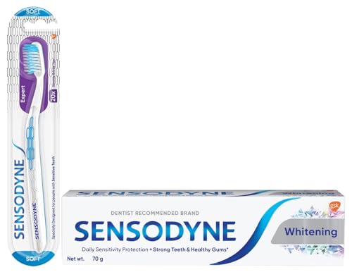 Sensodyne Toothpaste Whitening Sensitive tooth paste to restore natural whiteness 70 gmWhen the protective layer of teeth (enamel) is worn away or gums recede the dentine underneath becomes exposed. When the exposed dentine comes in contact with hot cold sweet or sour food and drinks it can trigger a sharp short sensation called tooth sensitivity. Sensodyne Whitening is a daily fluoride toothpaste that helps protect against tooth sensitivity while still providing the benefits of a regular paste like strong teeth and health gums. It also helps restore the natural whiteness of your teeth by removing stains and leaving you with a whiter smile. With twice daily brushing you can enjoy your favorite foods and drinks without the worry of sensitive teeth. Sensodyne Whitening tooth paste is available in a 70 gm pack. Always follow instructions and guidance included on the pack before use.Sensodyne Expert Toothbrush With 20X Slimmer & Soft Bristles 1 Piece (Multicolor)Sensodyne has designed and formulated an entire range of toothbrushes as well as toothpastes to accommodate different needs. Cleaning effectively is important for people especially with sensitive teeth - to help prevent plaque build-up while minimizing further wear and tear that can be caused by excessive brushing. Sensodyne Expert toothbrush is specially designed with experts for gentle yet thorough cleaning of teeth. It is scientifically crafted with cross active and soft bristles that provide effective cleaning of teeth while being gentle on teeth and gums. This toothbrush has 20X slimmer bristle tips compared to a regular flat trim manual toothbrush for cleaning hard-to-reach areas. This brush also comes with an advanced tongue cleaner and a non-slip ergonomic handle to ensure comfortable grip and good control while brushing. Sensodyne Expert tooth brush is available in two packs - Single (1 piece) and Triple pack (3 pieces - Buy 2 Get 1 free). Brush your teeth gently twice a day to avoid plaque build-up. Do not brush too hard as applying too much pressure can lead to overbrushing. It is recommended to change your toothbrush every three months. For optimal care of tooth sensitivity we recommend brushing in combination with Sensodyne toothpaste twice a day.