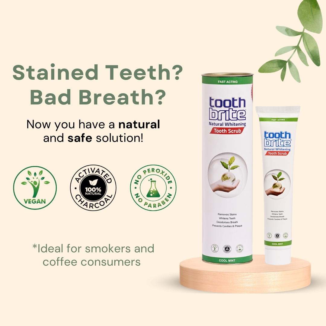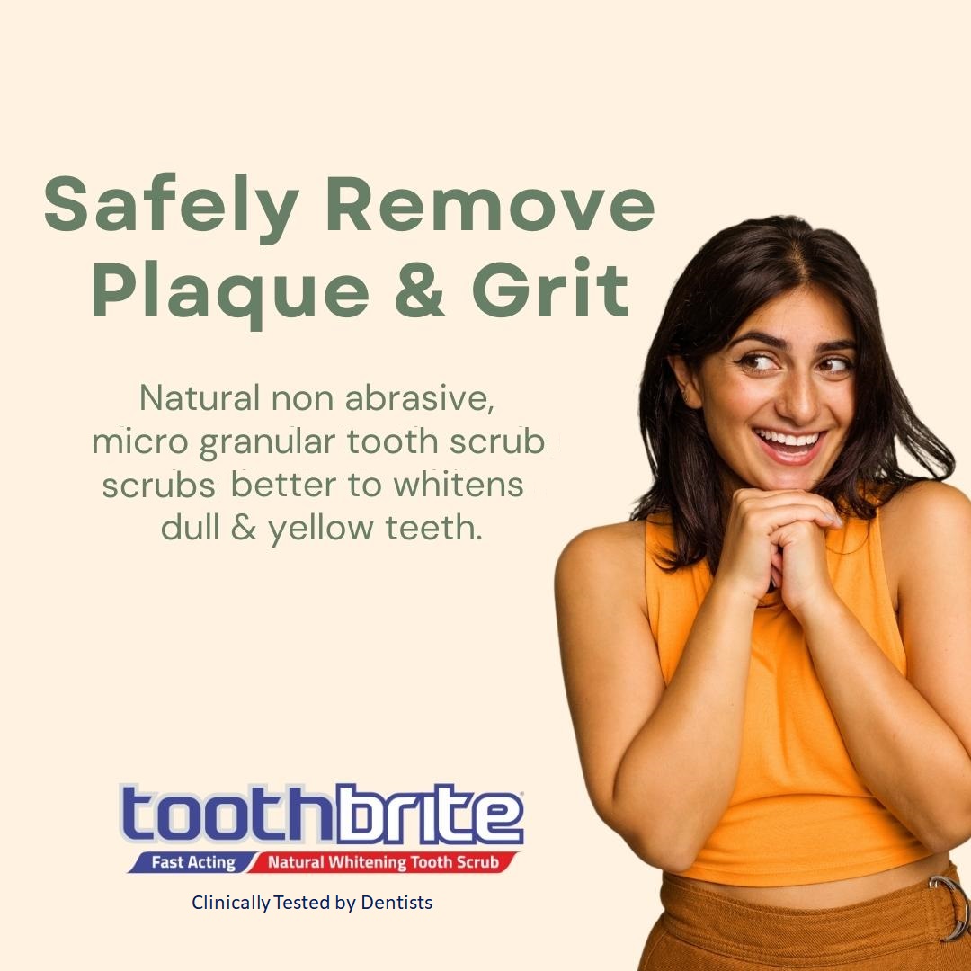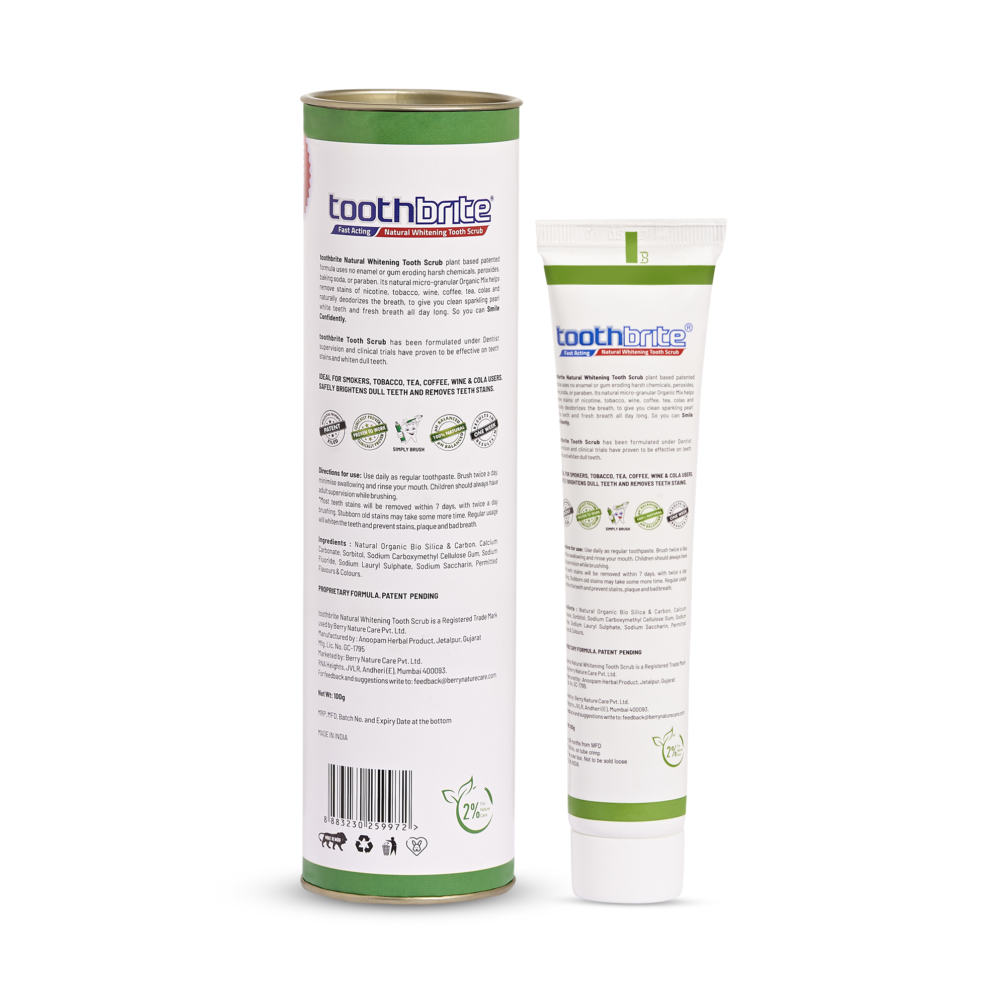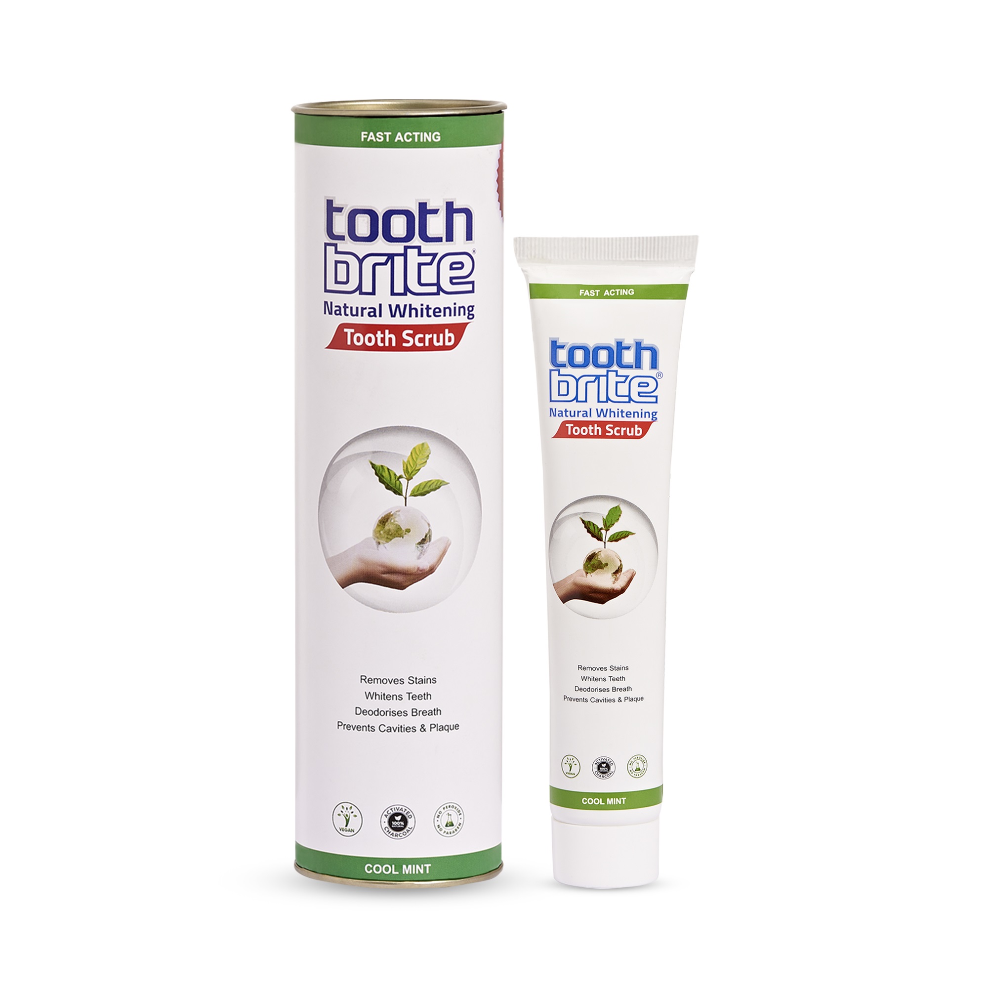 A good smile is an ice breaker in any interaction, but pale-yellow teeth can put an end to your relationship before it even starts. Don't let stained teeth ruin your chances at making a good impression. We are proud to introduce our new revolutionary patented natural micro granular tooth scrub with plant based active ingredient Natural Organic Bio Silica & Carbon that whitens teeth. When you brush with our unique Natural Organic Bio Silica & Carbon tooth scrub. The micro granules gently scrub away the plaque, stains of nicotine, coffee, tea, curry and colas coating your teeth to give you back your natural pearl white teeth without damaging your teeth enamel or gums. toothbrites natural active carbon gives benefit of deodorised breath for day long freshness. toothbrite is safe for the full family. Contains no harsh chemical, peroxides, baking soda, bleach or paraben. Brush Right with toothbrite Natural Whitening Tooth Scrub. Clinically tested by Dentists.