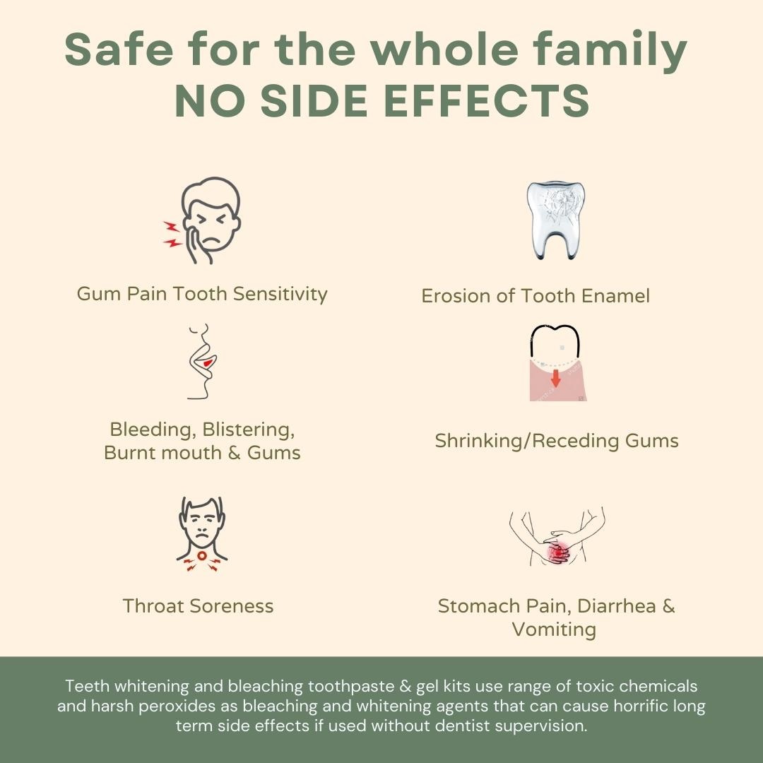 • Our natural whitening tooth scrub doesn't have any side effects like tooth sensitivity or gum irritation or enamel erosion which can occur with other chemical whitening toothpastes.