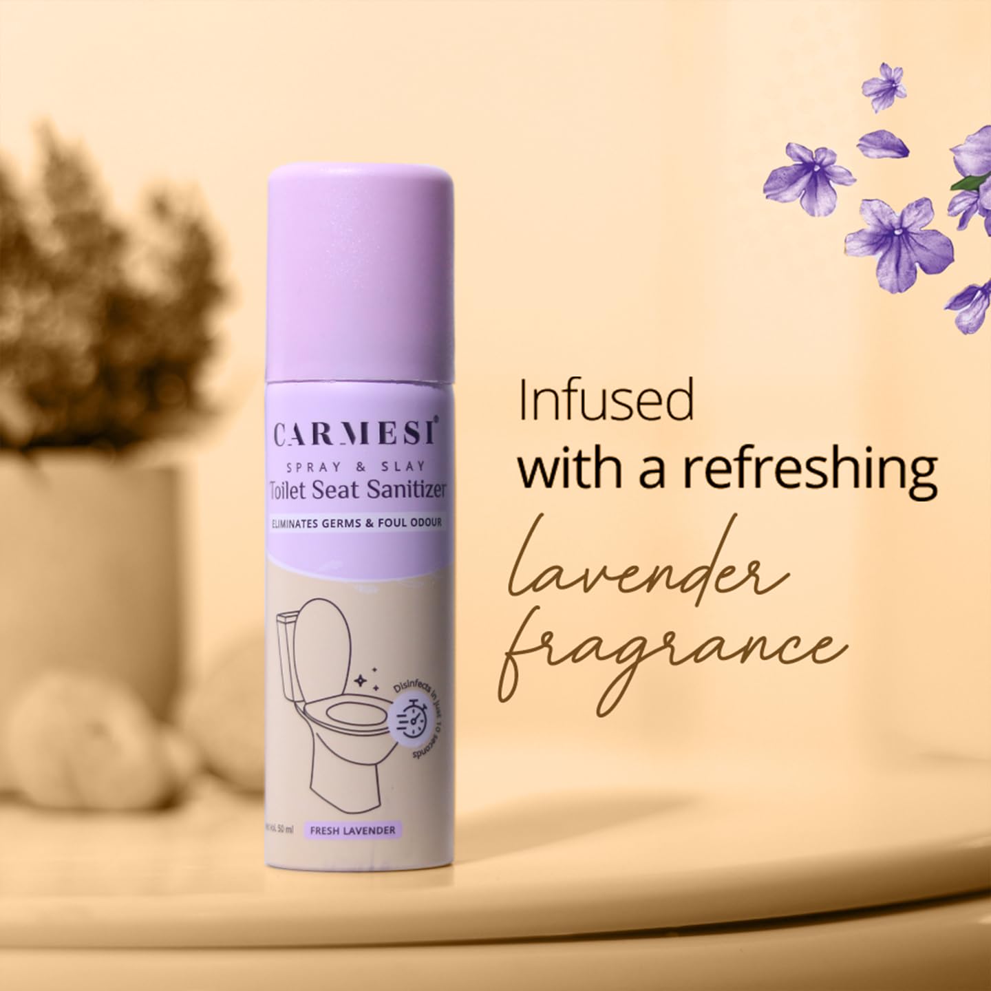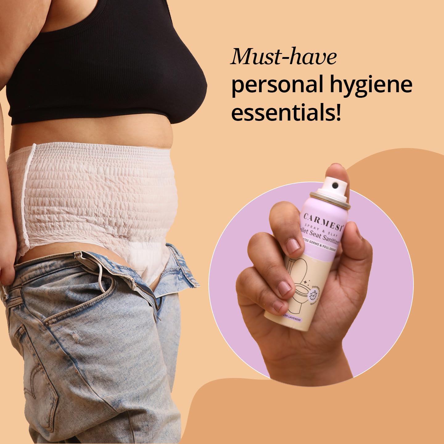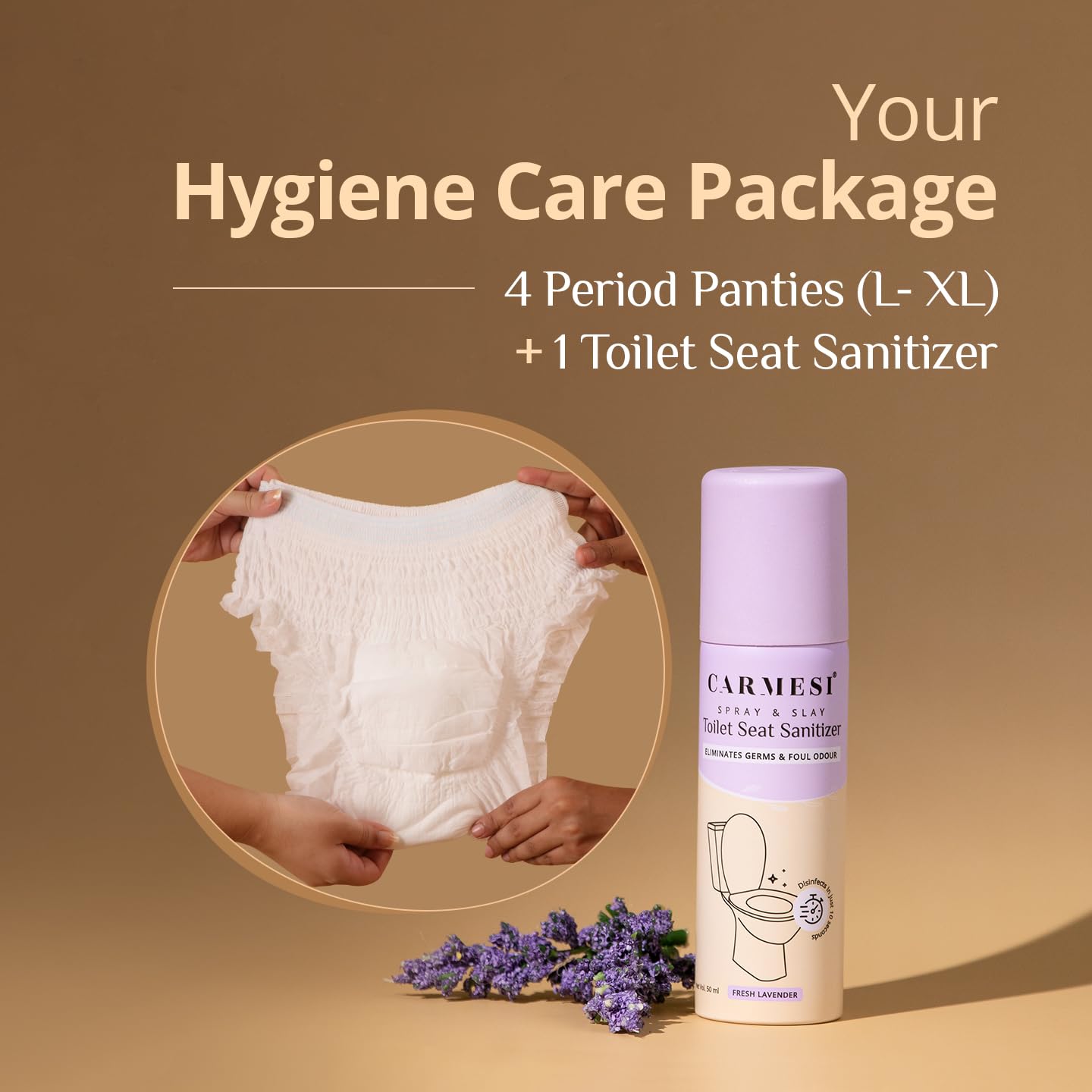 This Combo Pack contains 4 Carmesi Disposable Period Panties in the size L-XL and 1 Toilet Seat Sanitizer. Carmesi Disposable Period Panties - No more getting up at regular intervals in the night to check for period stains. Or even waking up in the morning to find your underwear in a mess. The Carmesi Disposable Period Panties let you sleep comfortably on your heavy-flow nights with absolutely no worry of leakages. This period panty helps provide 360° protection thereby keeping you safe from leaks all night long no matter how much you move around in your sleep. The Ultra-Absorbent Core of the period panty absorbs your flow super-quickly keeping you dry and comfortable as you sleep. No matter which position you like to sleep in you'll always be leak-proof. The Carmesi Period Panties also feel like regular underwear so you don't have to wear one along with this. Further the underwear hugs your body comfortably making you not feel a thing! Carmesi Toilet Seat Sanitizer - How many times have you squatted in public restrooms or avoided the usage of one simply because you were scared of getting infections? Now stay protected on the go using Carmesi Toilet Seat Sanitizer. This powerful disinfectant kills 99.9% of germs on toilet seats thereby safeguarding you from infections. No more holding your pee! Get instant protection from germs - spray and wait for just 10 seconds for your toilet seat to be safe for usage. Carmesi Toilet Seat Sanitizer is infused with lavender which leaves behind a refreshing and pleasant fragrance. It also eliminates foul odour. Further it's super-versatile. Apart from toilet seats this sanitizer can be used on door knobs flush faucets and taps. It's also travel-friendly. The compact size makes it super easy to carry. It fits inside your purse or bag so you can stay protected from germs on the go! Using it is simple. Shake well before each use and spray from a distance of 25 cm. Then wait for 10 seconds to evaporate.