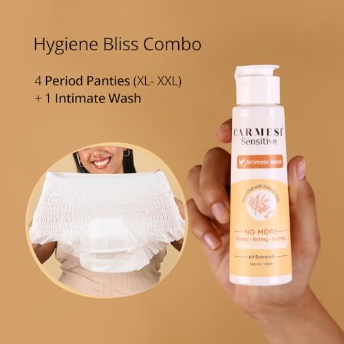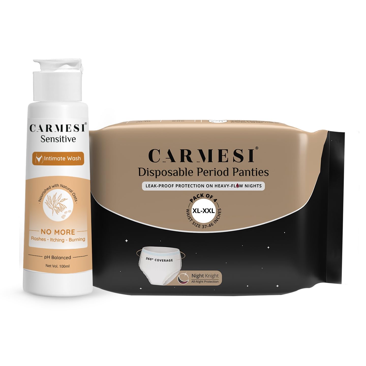 Up your intimate hygiene game with Carmesi Hygiene Bliss Combo. Meet Carmesi Sensitive Intimate Wash designed specially to prevent rashes and itching in the intimate area. These rashes could arise due to multiple factors such as using synthetic sanitary pads wearing tight clothes applying harsh soaps and experiencing hormonal shifts. No more getting up at regular intervals in the night to check for period stains. Or even waking up in the morning to find your underwear in a mess. The Carmesi Disposable Period Panties let you sleep comfortably on your heavy-flow nights with absolutely no worry of leakages