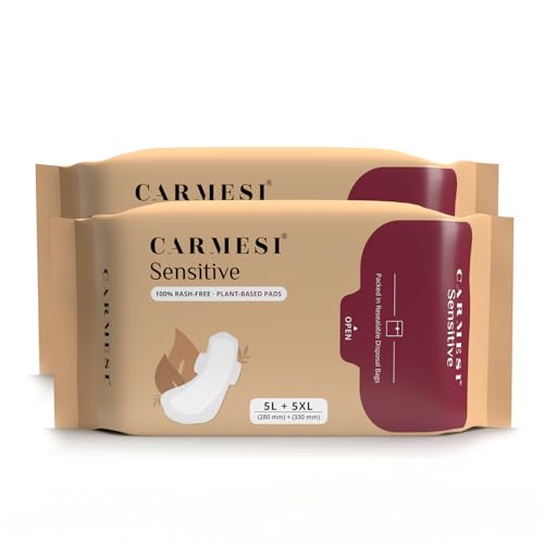 Carmesi Sensitive Sanitary Pads - Pack of 10 Pads (Large) - Certified 100% Rash-Free by Gynecologist - Natural Plant Top Sheet - No Fragrance, No Chlorine - With Disposal Bags