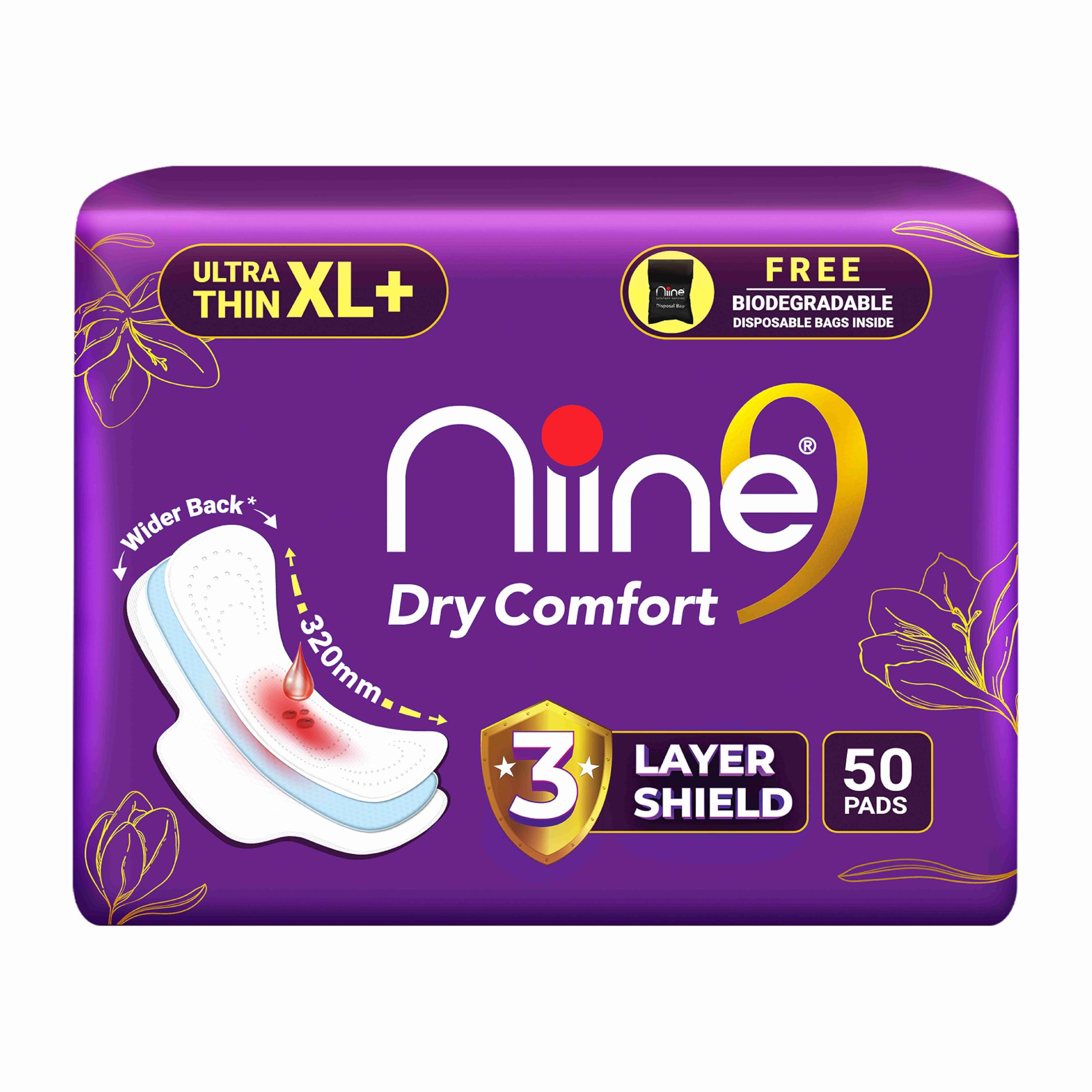 NIINE Dry Comfort Ultra Thin XL+ Sanitary Napkins for Heavy Flow (Pack of 1)50 Pads|320mm Long| Suitable for Heavy Flow|Faster Absorption |Prevents Wetness & Leakage Free Biodegradable disposable bags