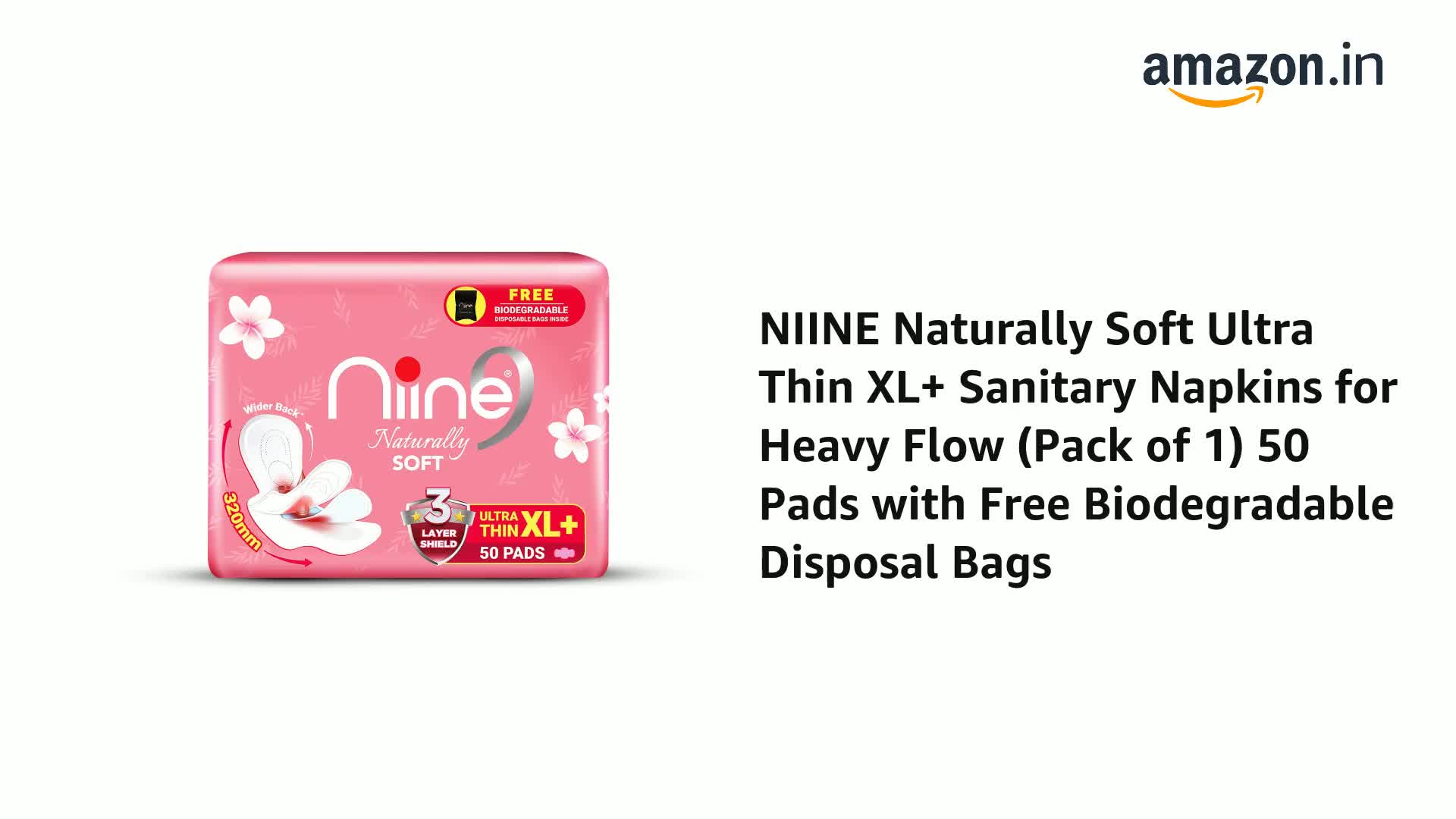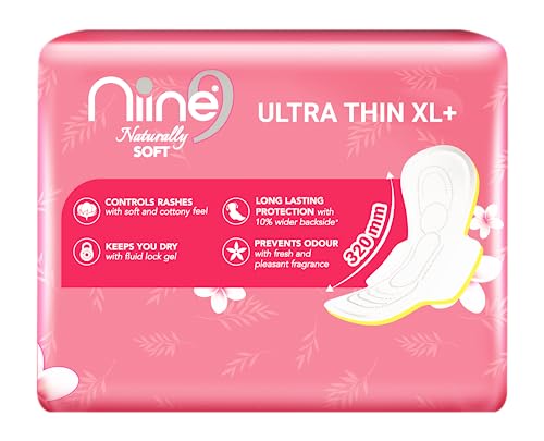 NIINE Naturally Soft Ultra Thin XL+ Sanitary Napkins |320mm Long|Cottony Soft Control Rashes|Long Lasting protection |Suitable for Heavy Flow with Free Biodegradable Disposal Bags (Pack of 1) 50 Pads