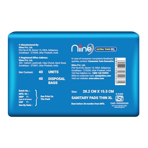 Niine Naturally Soft Ultra Thin XL Sanitary Pads (Pack of 1, 40 Pads) | 282mm Long | With Disposal Bag Inside with Fluid Lock Technology upto 100% Leakage Protection