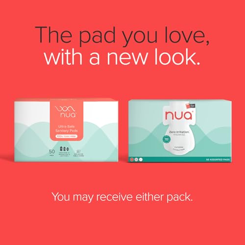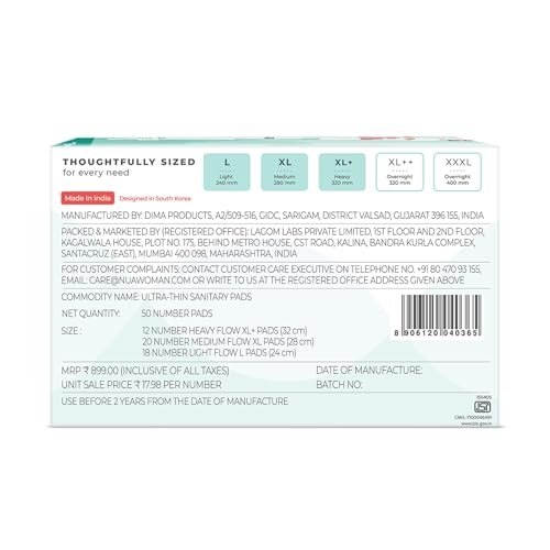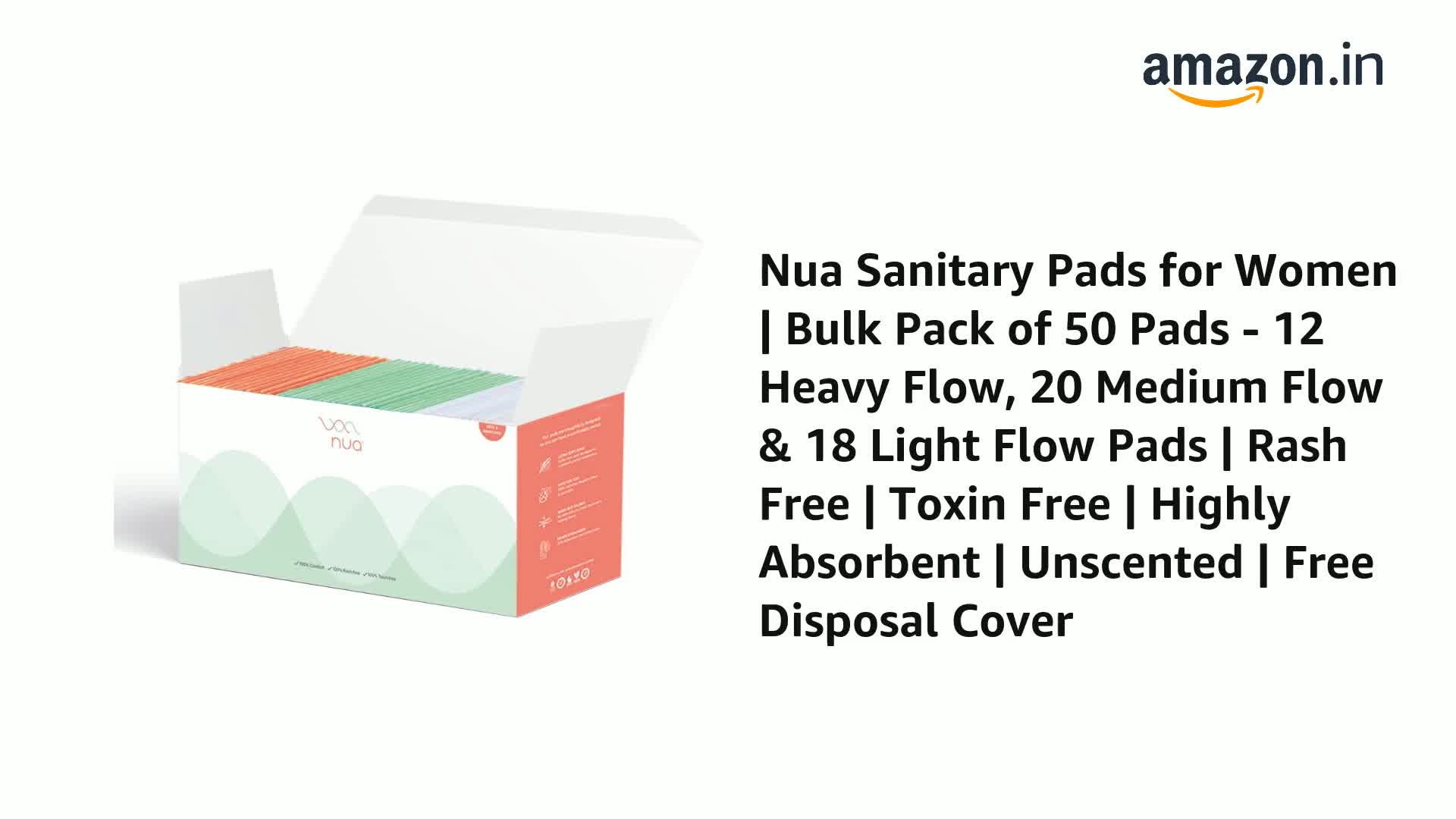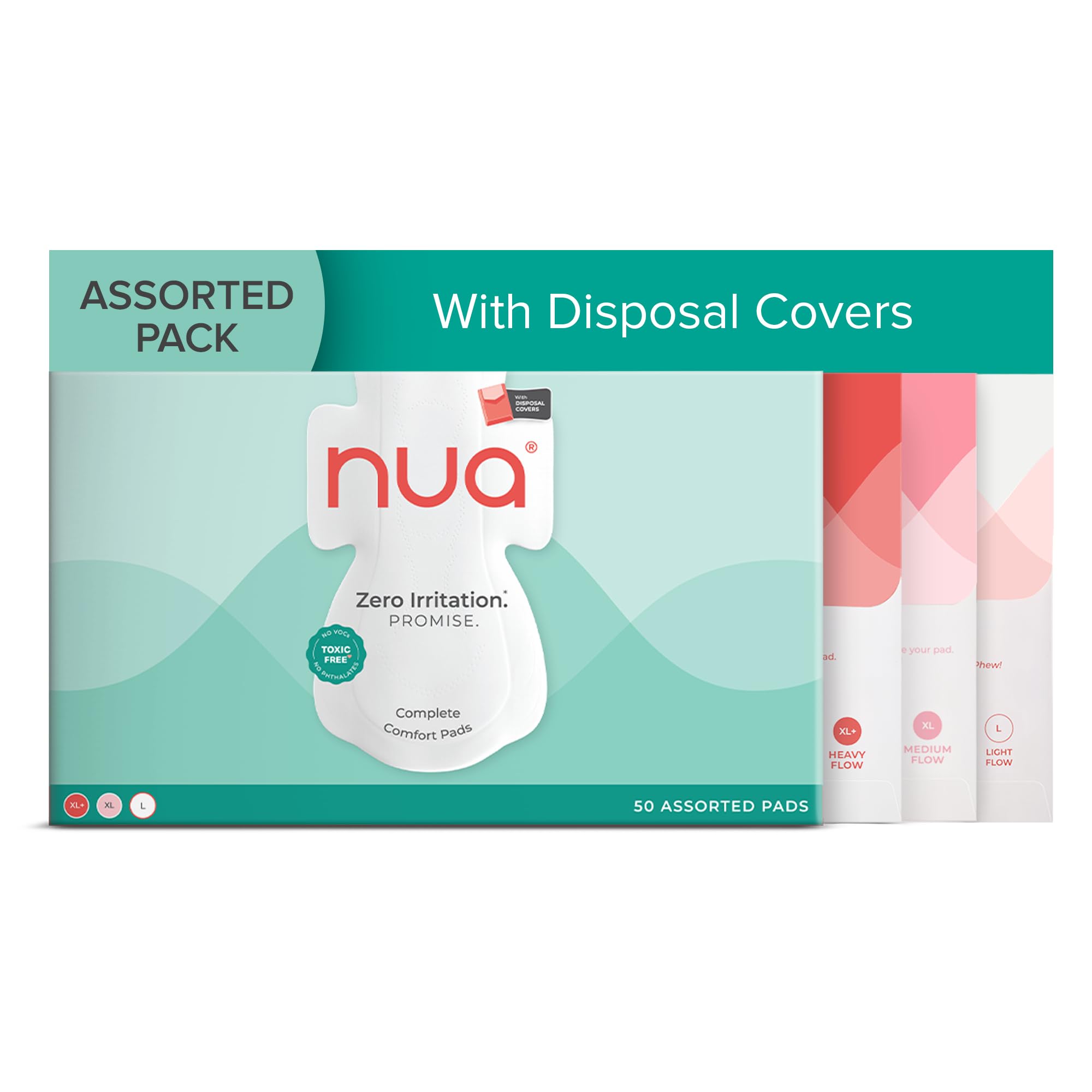 Nua Complete Comfort Sanitary Pads for Sensitive Skin | Pack of 50 Pads (12 Heavy Flow, 20 Medium Flow, 18 Light Flow) with Disposal covers | Zero Irritation | Comfortable All-Day Protection | Ultra-Thin | Super Absorbent | No rashes | 50% Wider Back | 10