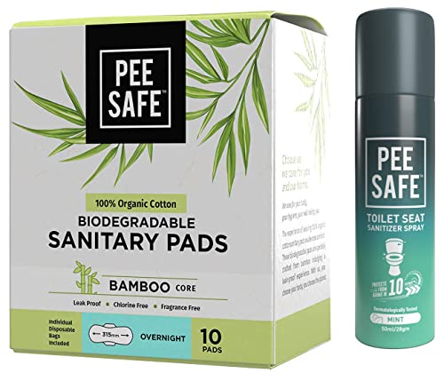 Pee Safe Organic Cotton Biodegradable Sanitary Pads, Overnight | Superb Absorbency & Toilet Seat Sanitizer Spray - Mint | Reduces The Risk Of UTI & Other Infections | Kills 99.9% Germs