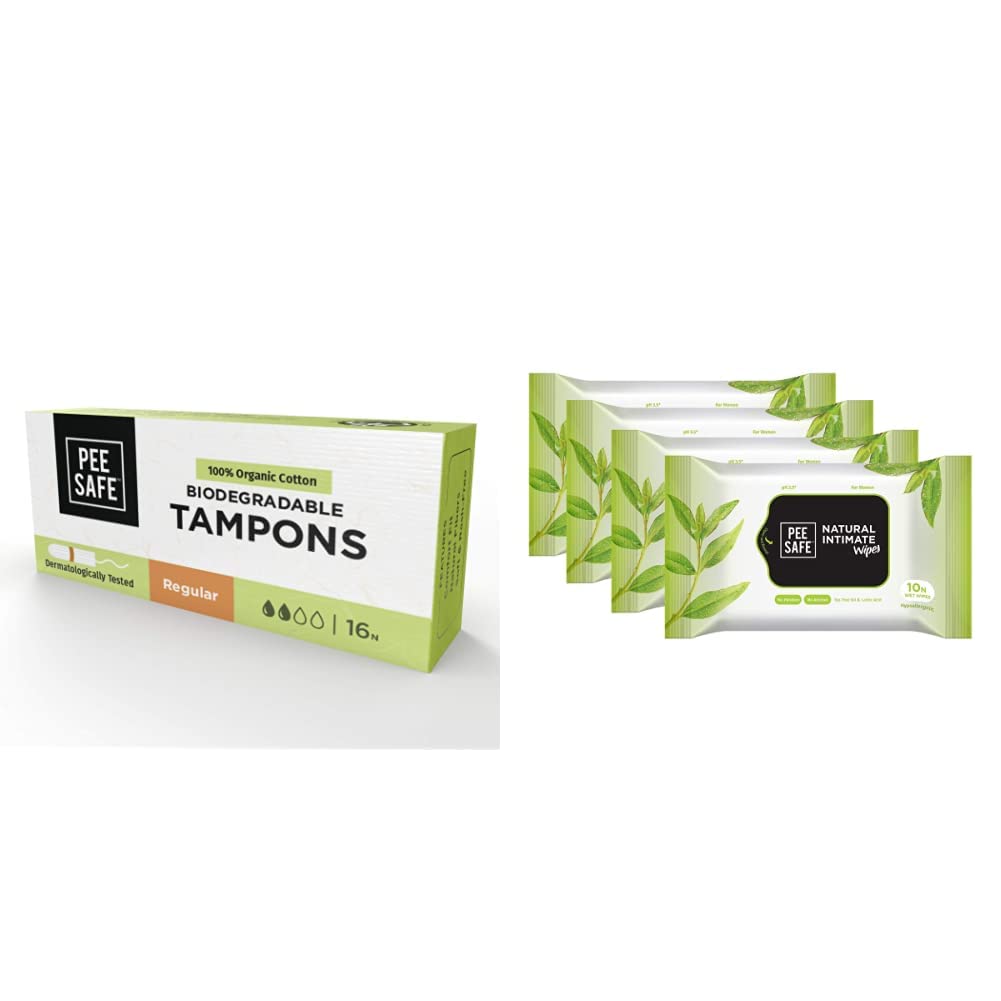 Pee Safe 100% Organic Biodegradable Cotton Tampons - Pack of 16 (Regular)100 percent organic cotton and fully bio-degradable PeeSafe tampons give you your freedom back in those trouble some days. No hassles no wetness no worries - only complete hygiene and freedom. Each tampon is crafted with 100 percent organic cotton which is grown without the use of toxic pesticides and synthetic fertilizers having a low impact on environment. It is biodegradable and free from chlorine bleach dyes and other synthetics. Pee Safe tampons are extra-soft natural easy to insert and even eco-friendly when disposed of.Peesafe Natural Intimate Wipes | 100% Alcohol-Free | pH Balanced | Skin Friendly For Daily Hygiene | Tea Tree Essential Oil | Paraben-Free | Sulfate-Free | 40 WipesSize: 40 wipespeesafe natural intimate wipes are made from viscose making them extremely soft and comfortable to use. It cleanses and freshens your intimate area without any hassle. Proper care is taken by the skin friendly ph. It is made from the natural extracts like tea tree essential oil. Natural intimate wipe is alcohol paraben and sls free. Its usage provides with freshness prevents rashes and allergies.