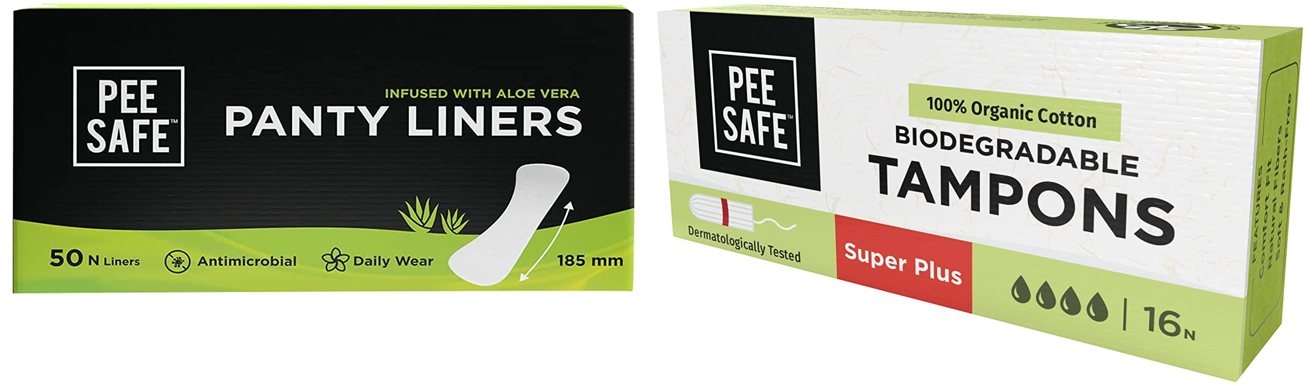 PEESAFE Aloe Vera Panty Liners (Pack of 50 Liners) | Curvy Design For Extra Comfort | Cottony-Soft Surface With 185mm Wide Optimal CoveragePee Safe panty liners keeps you dry and fresh all day long. Each liner is crafted with a cottony-soft surface infused with aloevera that lets you enjoy your day without worry of a little flow.PEESAFE Pee Safe Organic Cotton Tampons (Pack Of 16 Super Plus) | For Heavy Flow | Comfortable & Stain-Free Experience | Fda Approved100 percent organic cotton and fully bio-degradable PeeSafe tampons give you your freedom back in those trouble some days. No hassles no wetness no worries - only complete hygiene and freedom. Each tampon is crafted with 100 percent organic cotton which is grown without the use of toxic pesticides and synthetic fertilizers having a low impact on environment. It is biodegradable and free from chlorine bleach dyes and other synthetics. Pee Safe tampons are extra-soft natural easy to insert and even eco-friendly when disposed of.