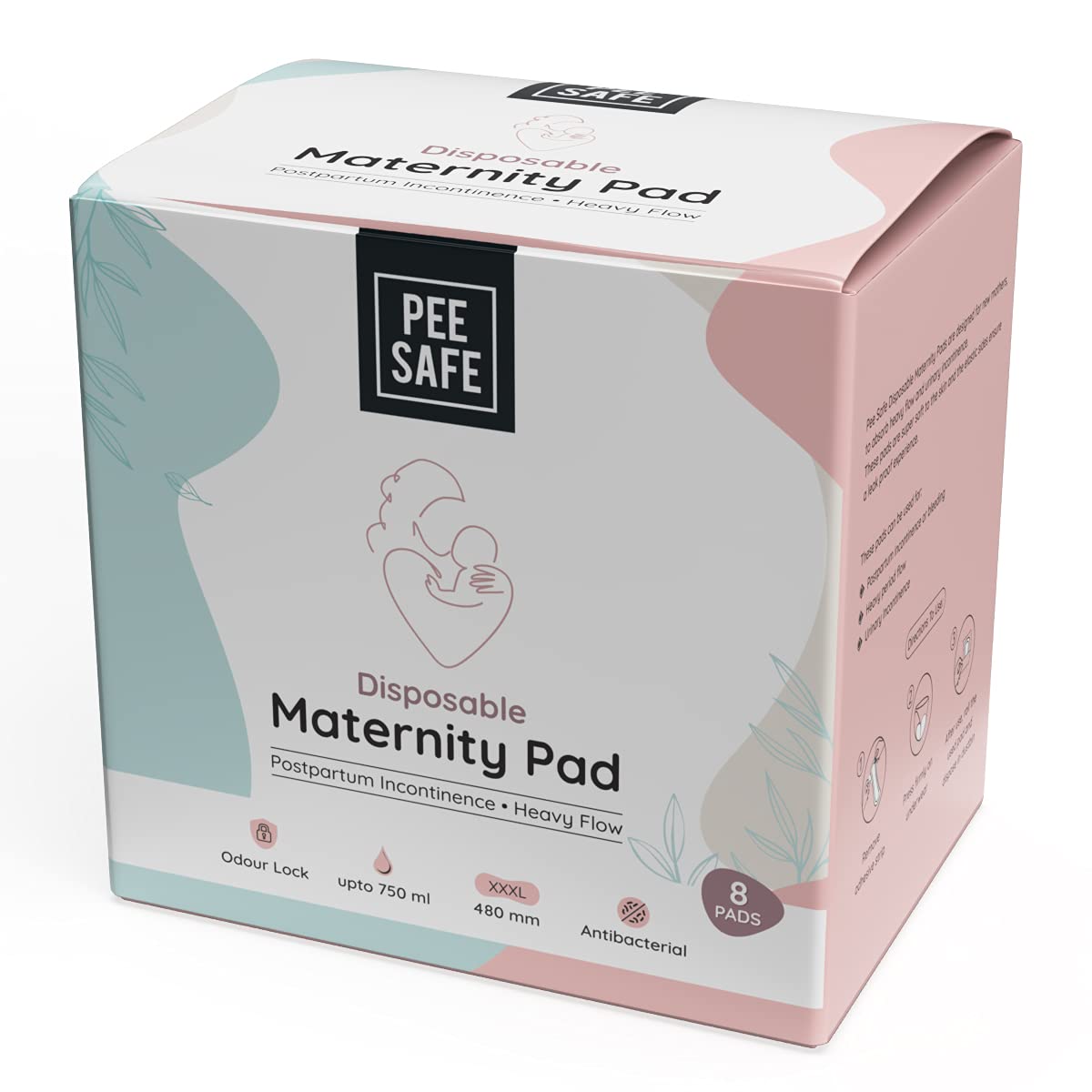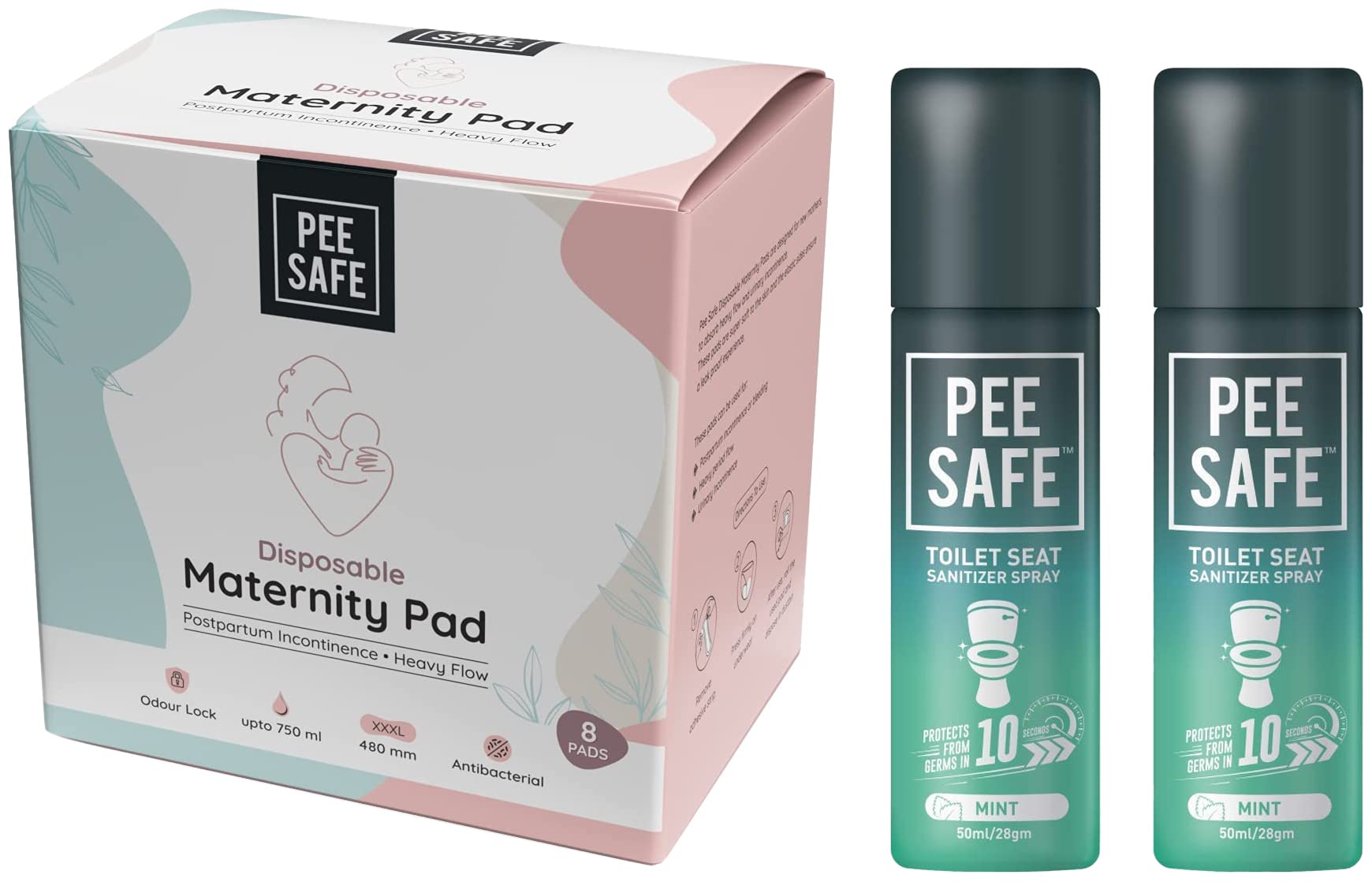 HomeHealth & PersonalPersonal CareWomen WellnessPEESAFE Maternity Pads - Pack Of 8 | Absorbs Up To 750ML Fluid & Toilet Seat Sanitizer Spray - Mint Reduces The Risk of UTI & Other Infections Kills 99.9% Germs & Travel Friendly - Pack of 2