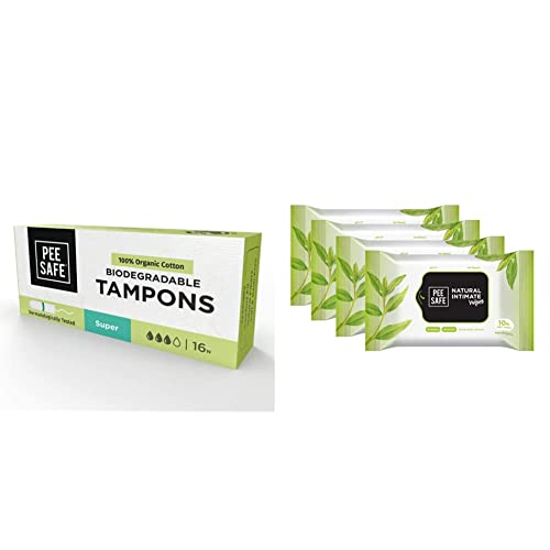 Pee Safe 100% Organic Biodegradable Cotton Tampons - Pack of 16 (Super)100 percent organic cotton and fully bio-degradable PeeSafe tampons give you your freedom back in those trouble some days. No hassles no wetness no worries - only complete hygiene and freedom. Each tampon is crafted with 100 percent organic cotton which is grown without the use of toxic pesticides and synthetic fertilizers having a low impact on environment. It is biodegradable and free from chlorine bleach dyes and other synthetics. Pee Safe tampons are extra-soft natural easy to insert and even eco-friendly when disposed of.Peesafe Natural Intimate Wipes | 100% Alcohol-Free | pH Balanced | Skin Friendly For Daily Hygiene | Tea Tree Essential Oil | Paraben-Free | Sulfate-Free | 40 WipesSize: 40 wipespeesafe natural intimate wipes are made from viscose making them extremely soft and comfortable to use. It cleanses and freshens your intimate area without any hassle. Proper care is taken by the skin friendly ph. It is made from the natural extracts like tea tree essential oil. Natural intimate wipe is alcohol paraben and sls free. Its usage provides with freshness prevents rashes and allergies.