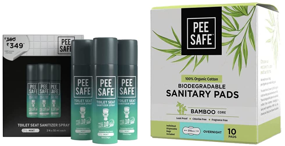 Peesafe Toilet Seat Sanitizer Spray - 50 ml & Pee Safe Organic Cotton Biodegradable Sanitary Pads Overnight | Superb Absorbency | Long Lasting Protection | Skin Friendly | Comfortable & Easy To Use