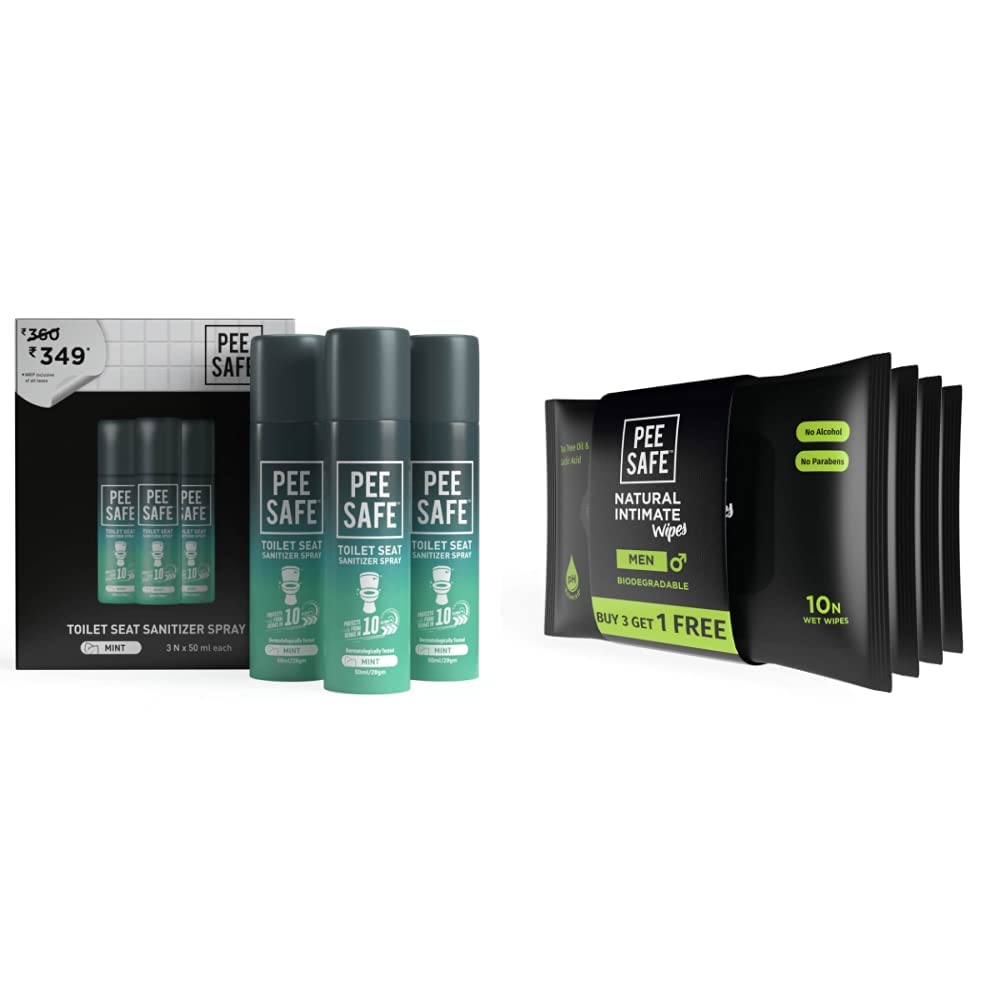 Pee Safe Toilet Seat Sanitizer Spray (50ml - Pack Of 3) - Mint | Reduces The Risk Of UTI & Other Infections | Kills 99.9% Germs & Travel Friendly | Anti Odour DeodorizerPee Safe is Convenient and easy to use disinfectant for toilets and can be also used during traveling. Always keep Pee Safe handy. Acts as a disinfectant for Toilet Seats Door handles Flush Knobs etc keeping you safe from Bacterial and Viral infections. 99.99% sanitization from toilet borne diseases in 5 seconds!Pee Safe Intimate Wipes for Men Biodegradable pH balanced - 40 Wipes (Pack of 4)Pee Safe Intimate Wipes for men are crafted to maintain your intimate hygiene. These wipes are made from bamboo pulp and extremely soft and comfortable to use. It cleans and refreshes your intimate area without any hassle and can be used before and after sexual activity or after urination. Intimate wipes for men are enriched with the goodness of Tea Tree oil and perfect for keeping you fresh at any time of the day. The unique composition of Intimate Wipes for men ensures proper care with a skin-friendly pH with Aloe vera Extracts as a natural moisturizer. Along with Tea tree oil and Aloe vera extract the Pee Safe Intimate Wipes formulation comprises of Calendula oil which has natural properties that help to get rid of unpleasant odour caused by microbes.