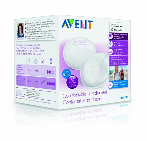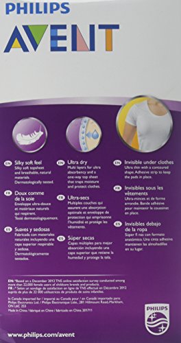 Developed with breastfeeding expert Vicky Scott Philips AVENT SCF254/10 Disposable Day Breast Pads protect your bra and clothes from breast milk leakage all day long. Soft and comfortable with a contoured fit these pads easily slip into a nursing bra or regular bra and are invisible under clothes. Multiple layers provide exceptional absorbency and a one-way top sheet traps moisture inside the pad to help nursing moms feel comfortable whenever let-down occurs during the day. Made of breathable natural materials these pads are hygienic and dermatologist tested to be gentle on skin. The top sheet has a silky feel to prevent irritation and adhesive tape secures each pad to your bra so it won't shift around as you move through your day. Philips AVENT Breast Pads feature a unique four layered construction for maximum dryness: (1) Ultra soft top layer with nipple indent keeps breast dry at all times (2) Ultra absorbent layer cushioned for extra comfort (3) Ultra absorbent core draws in moisture to guard against embarrassment (4) Ultra breathable outer layer helps avoid sore nipples. For cleanliness and portability each pad is individually wrapped in discreet packaging making them easy to take with you in a purse diaper bag or briefcase.