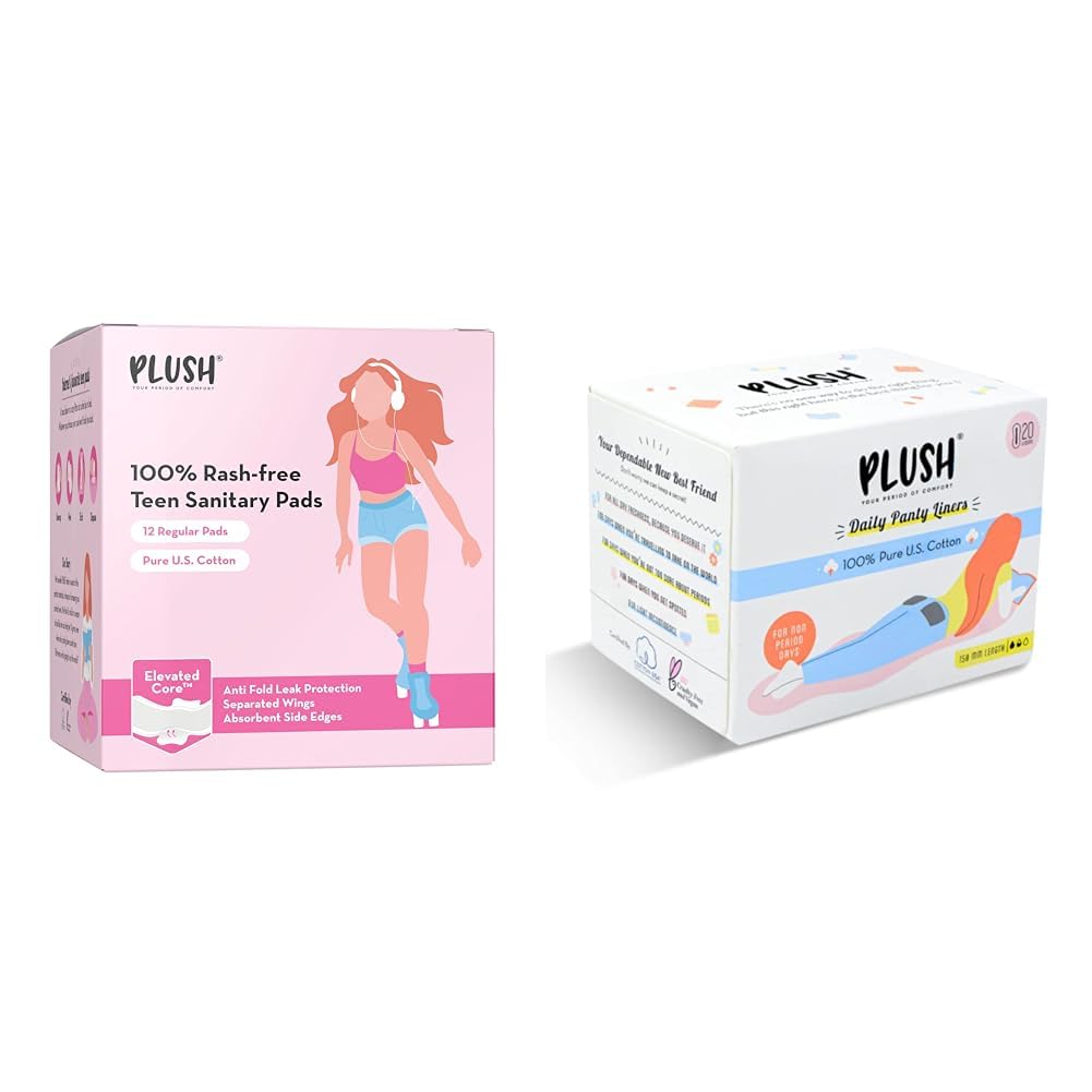 Plush Teen Sanitary Pads (Pack of 12) + 20 Panty Liners(150mm) Bundle | Ultra-thin Rash Free Sanitary Napkins for Women & Liners for Daily Use