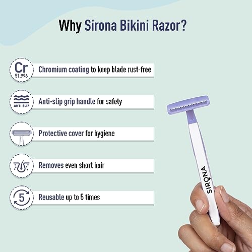 • Reusable: Sirona Bikini Razor is reusable up to 5 times given the blade is coated with Chromium and PTFE that resist corrosion and rusting leading to an extended shelf life. The debris doesn't get collected in the blade as it is non-sticky thereby making
