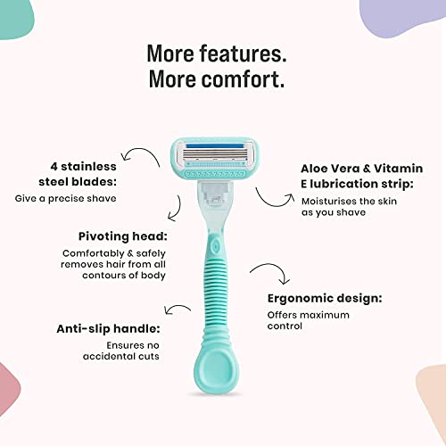 Sirona 4-blade Cartridge Razor is designed to ensure you get a clean and efficient shave every time. Its replaceable cartridge helps you to simply replace the blades when they wear out. 4 stainless steel blades ensure a precise shave. Pivoting head comfortably and safely removes hair from all contours of the body. Aloe Vera & Vitamin E lubrication strip moisturises the skin as you shave.