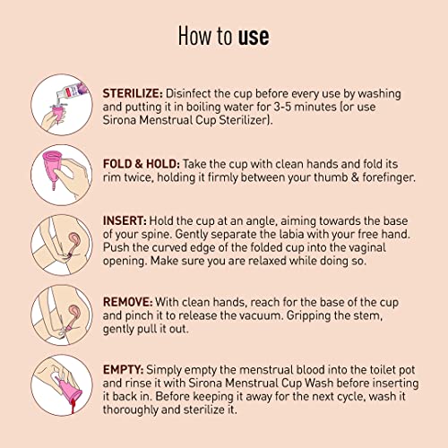 • SAFE TO USE: Sirona’s menstrual cups are made using medical-grade silicone. This is a biocompatible toxin-free odourless and hypoallergenic material which can be inserted into the vaginal canal to collect menstrual fluid. The Menstrual Cup Sterilizer is