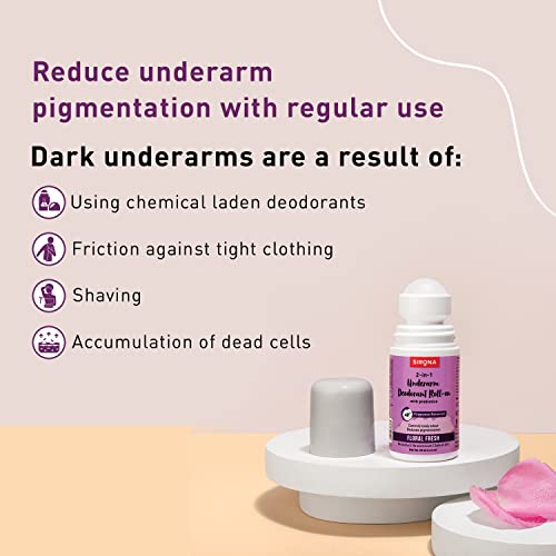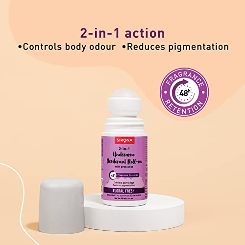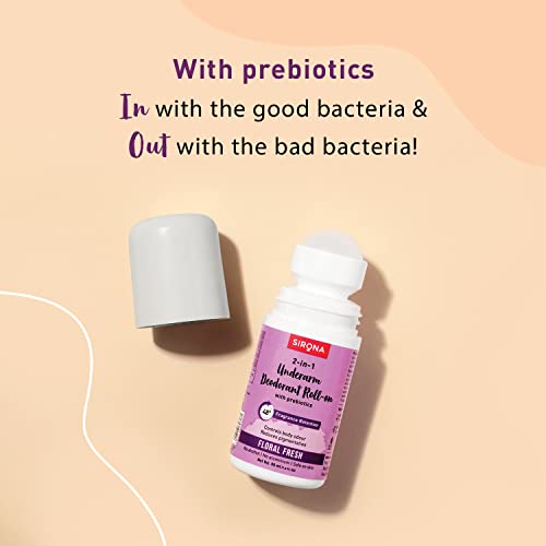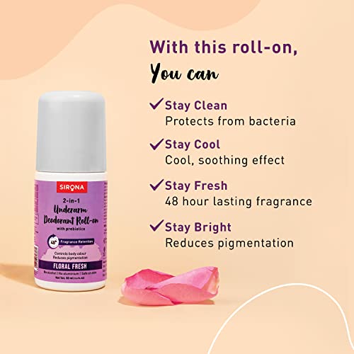 Sirona Underarm Roll On with 0.5% Prebiotic, 0.5% Niacinamide & 0.1% Hyaluronic Acid | Prevents Body Odour & Exfoliates Underarms | Floral Fresh Fragrance | Alcohol & Aluminium Free | 50 ml