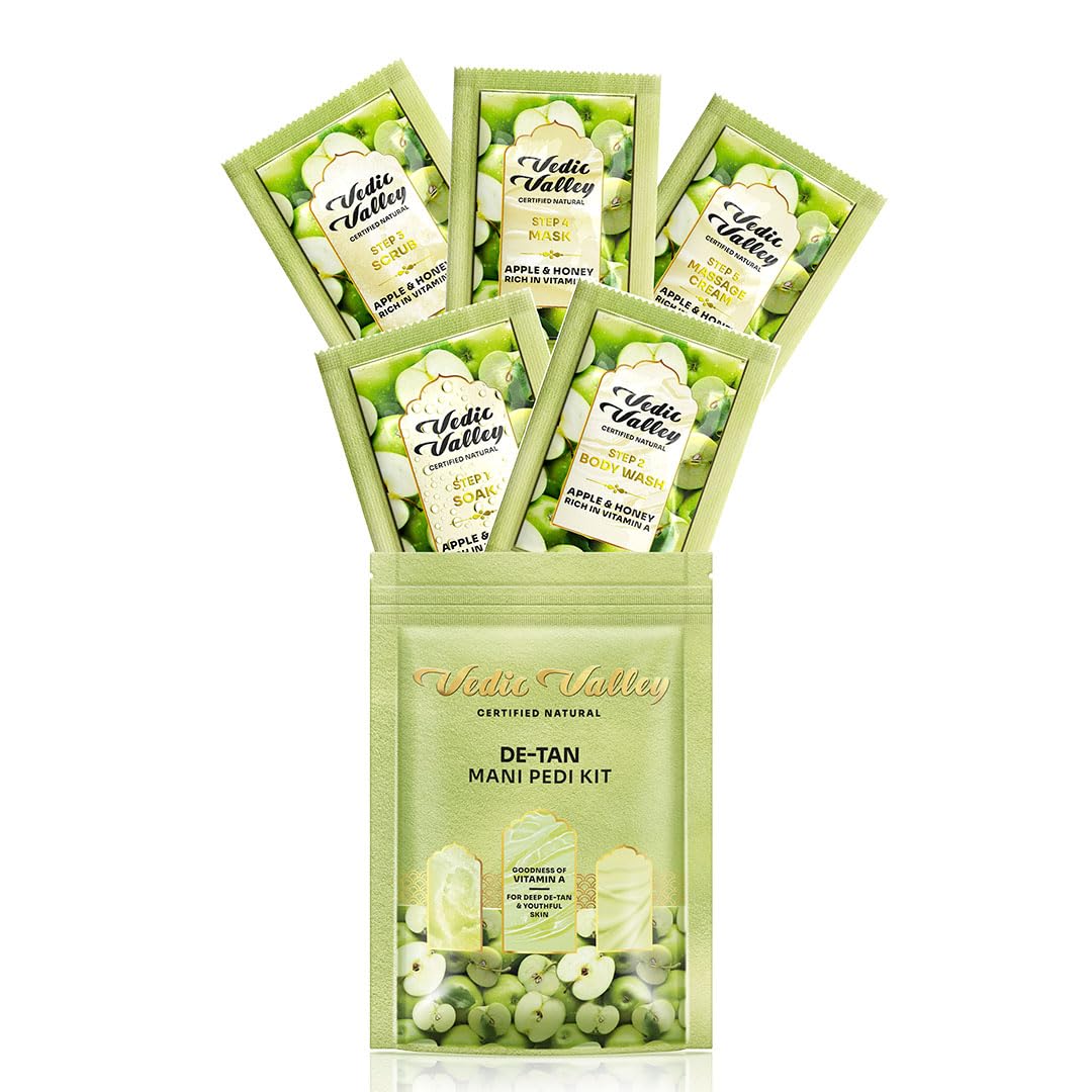 De-tan with guava spice and everything nice When fresh guava meets oh-so-spicy chili along with a rich dose of Vitamin C you can fade your tan easily. Get refreshed bright skin that's no tan and all smiles. This DIY 5 step mani-pedi kit contains soak body wash scrub Fancy Coverand massage cream. It is a premium one-time kit that will make you say ta-ta to your tan and hello to your glow. Guava's antioxidant may protect your skin from damage which can slow down its aging process. Vitamin C protects skin from free-radical damage and signs of aging. How to use the product: Soak: warm water and dip hands/feet Body Wash: Work up lather. Massage and rinse. Scrub: Gently massage to exfoliate. Thoroughly rinse : Apply a thin layer on the skin. Allow it to dry and then rinse. Massage Cream: Gently massage.
