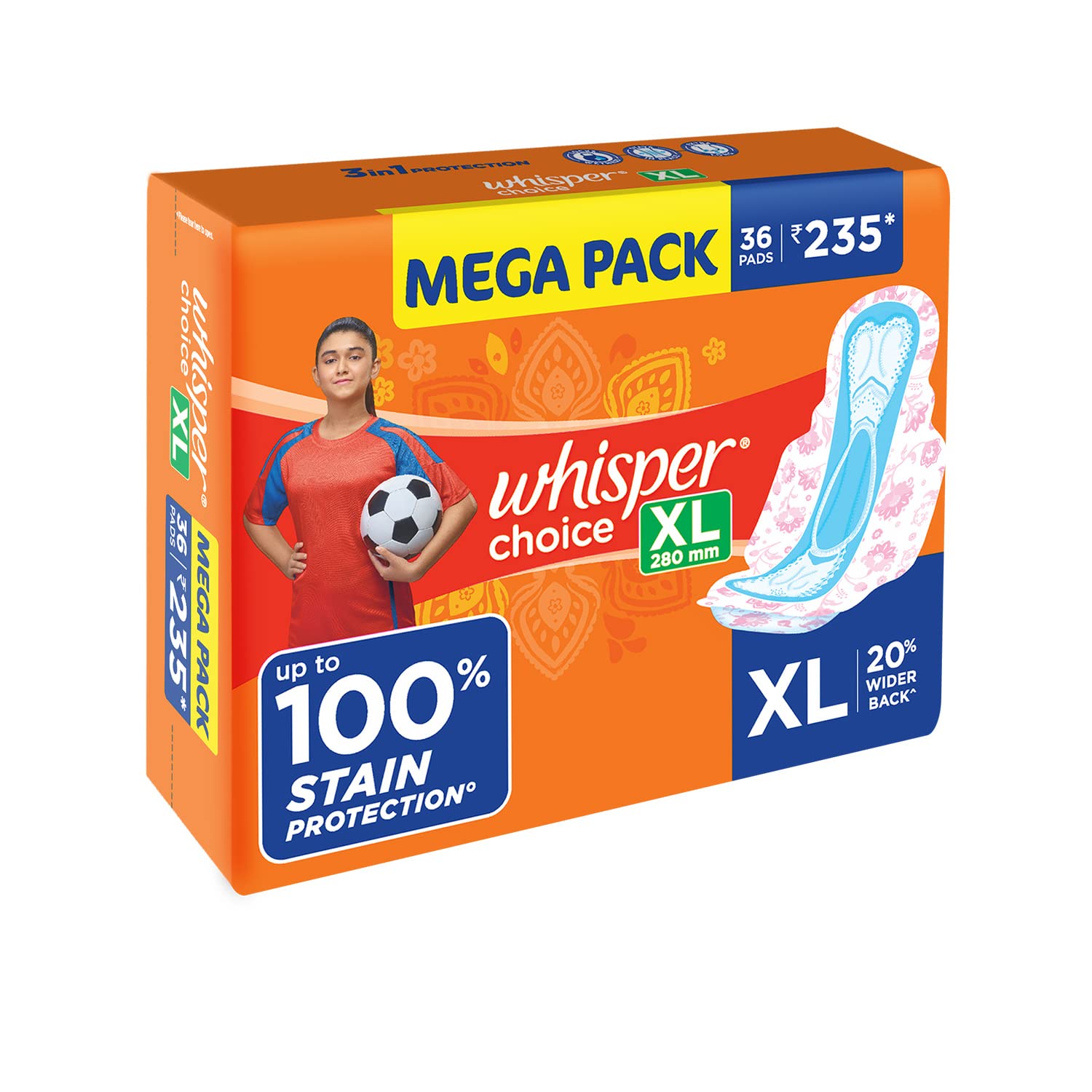 HomeHealth & PersonalPersonal CareWomen WellnessWHISPER CHOICE SANITARY PADS 36 XL PADS UPTO 100% STAIN PROTECTION ALL DAY LONGER LENGTH FOR BETTER COVERAGE 20% WIDER BACK DRY TOP SHEET WITH WINGS