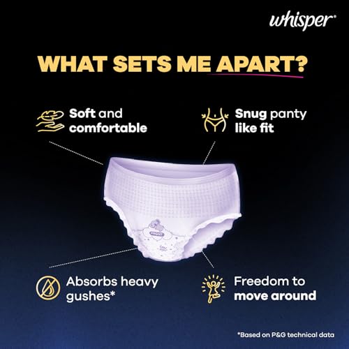 HomeHealth & PersonalPersonal CareWomen WellnessWhisper Super Absorbent Period Panty, 6 M-L Pants, 360 Degree Leakage Protection for Heavy Flow, Panty like Fit for Full back Coverage, Absorbs Heavy Gushes, Silky Soft, Comfortable Feel