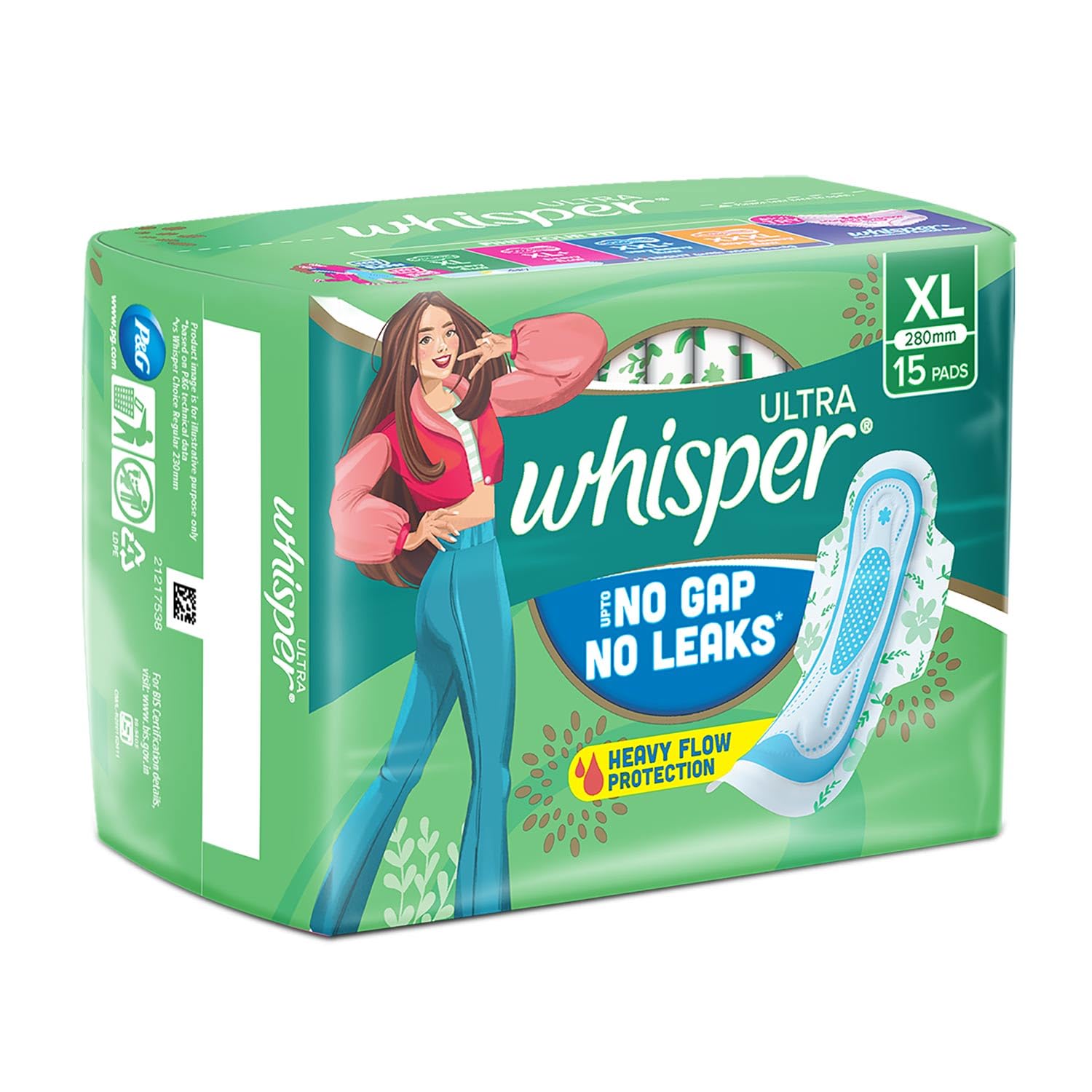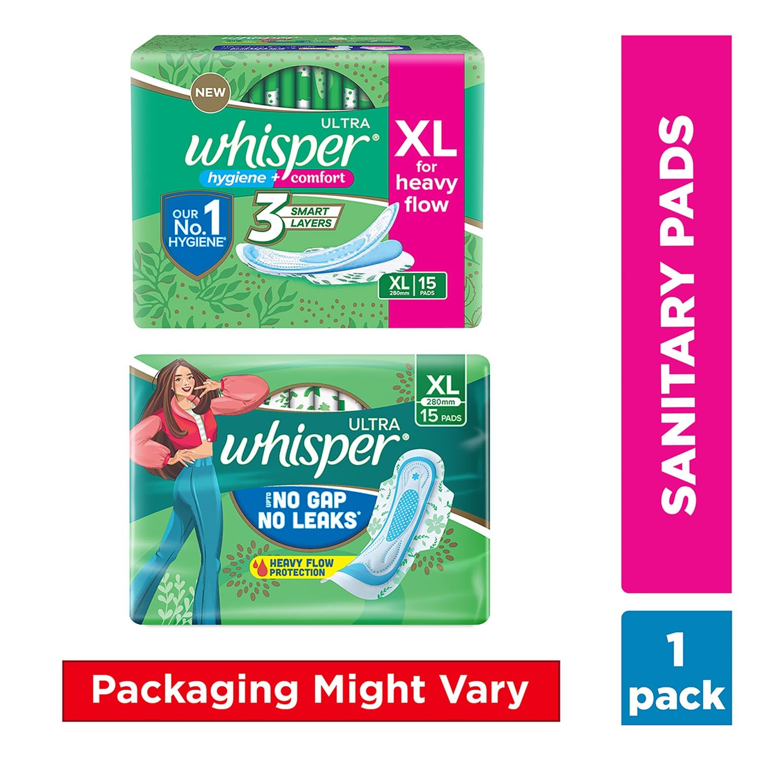 WHISPER ULTRA HYGIENE+COMFORT SANITARY PADS 15 XL PADS FOR HEAVY FLOW LONG LASTING PROTECTION LOCKS ODOUR & WETNESS DRY TOP SHEET DISPOSABLE WRAPPER