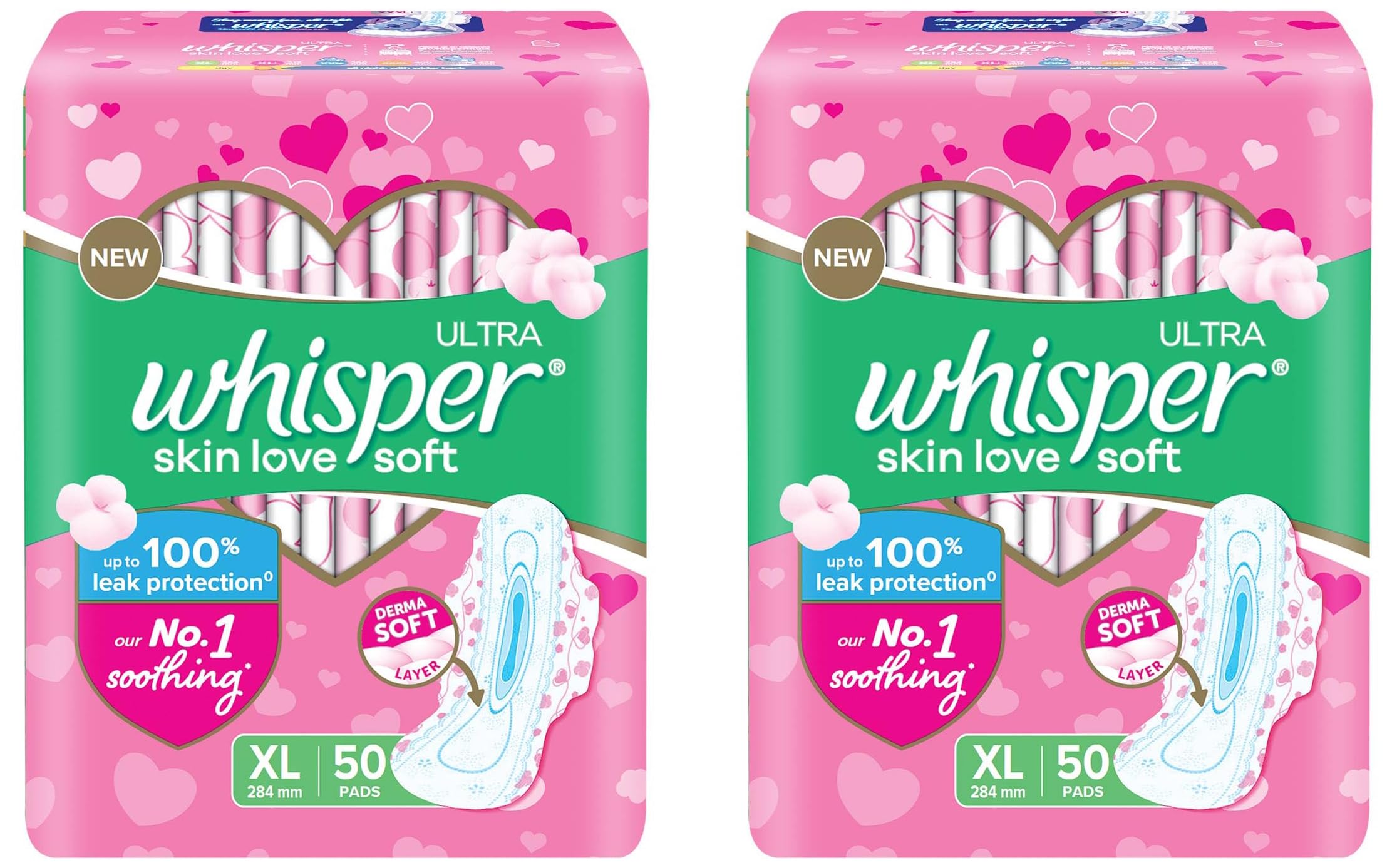 Whisper Ultra Skinlove Soft Sanitary Pads for Women|50 thin Pads|XL|Cottony soft|our #1 Softness|Soft top sheet|Irritation free |28.4 cm Long|With disposable wrap (Pack of 2)