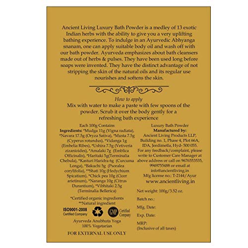 Bath powders have been used long before soaps were invented. Ayurvedic texts mention about bath cleansers made of green gram powder rice powder with various fragrant herbs added to them. To indulge in Ayurvedic Abhyanga snanam one can apply suitable body oil like sesame or cold pressed almond and wash off with a traditionally made Ayurvedic bath powder also known as Ubtan or bath powder. Ancient Living Ayurvedic luxury bath Powder (Ubtan) is made of healing Navara rice Mudga Musta Vidanga Ushira Amalaki Haritaki Kasturi Harida Bakuchi Shati Chickpea Naranga& Vibhitaki. This medley of 13 herbs makes it a very uplifting bathing experience. Navara rice used in classical Ayurvedic treatments is cultivated only in Kerala great for exfoliation. Ashtangahridayam a 12th-century Ayurvedic book applauds the qualities of Navara Rice. Naranga gives clear skin while Amalaki rich with Vit C imparts the glow. Vetiver cools the skin while removing any pigmented spots. Kasturi enhances complexion while real sandal pampers the skin with its exotic fragrance. Manjista is a natural detoxifier. Vidanga is a strong anti-microbial helps ward off skin infections. Mudga softens the skin.