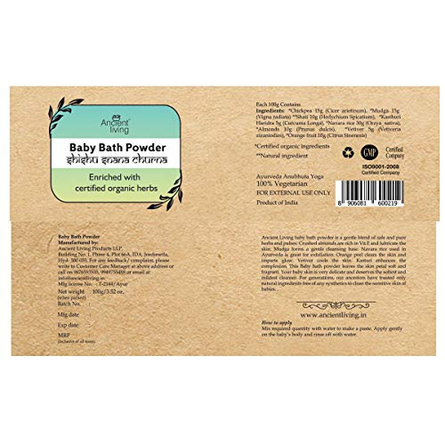 Ancient Living offers bath powders for both children and adults. These are made of organic safe and pure herbs and pulses to give a wholesome bath experience. Some of the ingredients include crushed almonds Navara rice Kasturi Vetiver etc. Almonds are rich in Vit E and lubricate the skin. Mudga powder and Chanaka powders form a gentle cleansing base. Navara rice used in classical Ayurvedic treatments cultivated only in Kerala is great for exfoliation. Orange peel clears the skin and imparts the glow. Vetiver cools the skin while removing any pigmented spots. Kasturi enhances the complexion. Thes baby bath powders leave the skin petal soft and fragrant.