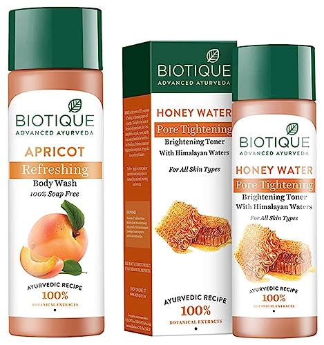 Biotique Bio Apricot Refreshing Body Wash 190mlBiotique Bio Apricot 100% Soap Free Refreshing Body Washÿis a soap free cleanser which contains apricot kernel oil wild turmeric turmeric kurchi and soap nut. Apricot is great for exfoliating the skin. With apricot gel your skin looks perfectly cleaned without being hydrated. It removes all microbes and pollutants with drying the skin unlike other soaps. Because of its soothing quality it can be used as an excellent alternative to the soap as cleanses the body with softness.Biotique Bio Honey Water Clarifying Toner 120mlRejuvenate your skin after a hectic day by using this Honey Water Face Freshener - Bio Honey (ECO) from Biotique. This freshener is in a gel form that will form a rich lather to deeply cleanse the impurities from the pores. Enriched with pure honey and extracts from the bark of the Arjun tree (Terminalia arjuna) Chhoti Duddhi (Ephorbia thymofolia) and Ritha (Sapindus trifoliatus) this 100% soap-free gel will not only soften but also lighten the skin complexion. Dirt grime and oiliness would be eradicated in moments once you will use this gel. Start using Biotique Honey Water Face Freshener - Bio Honey (ECO) to discover that lost radiant glow on your skin. Rejuvenate your skin after a hectic day by using this Honey Water Face Freshener - Bio Honey (ECO) from Biotique. This freshener is in a gel form that will form a rich lather to deeply cleanse the impurities from the pores. Enriched with pure honey and extracts from the bark of the Arjun tree (Terminalia arjuna) Chhoti Duddhi (Ephorbia thymofolia) and Ritha (Sapindus trifoliatus) this 100% soap-free gel will not only soften but also lighten the skin complexion. Dirt grime and oiliness would be eradicated in moments once you will use this gel. Start using Biotique Honey Water Face Freshener - Bio Honey (ECO) to discover that lost radiant glow on your skin.