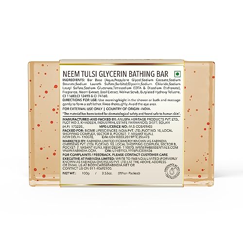 fabessentials Neem Tulsi Glycerin Bathing Bar | with Walnut Granules | for Cleansing Nourishing and Rejuvenating Skin | Vegan & Toxin Free - 100 gm