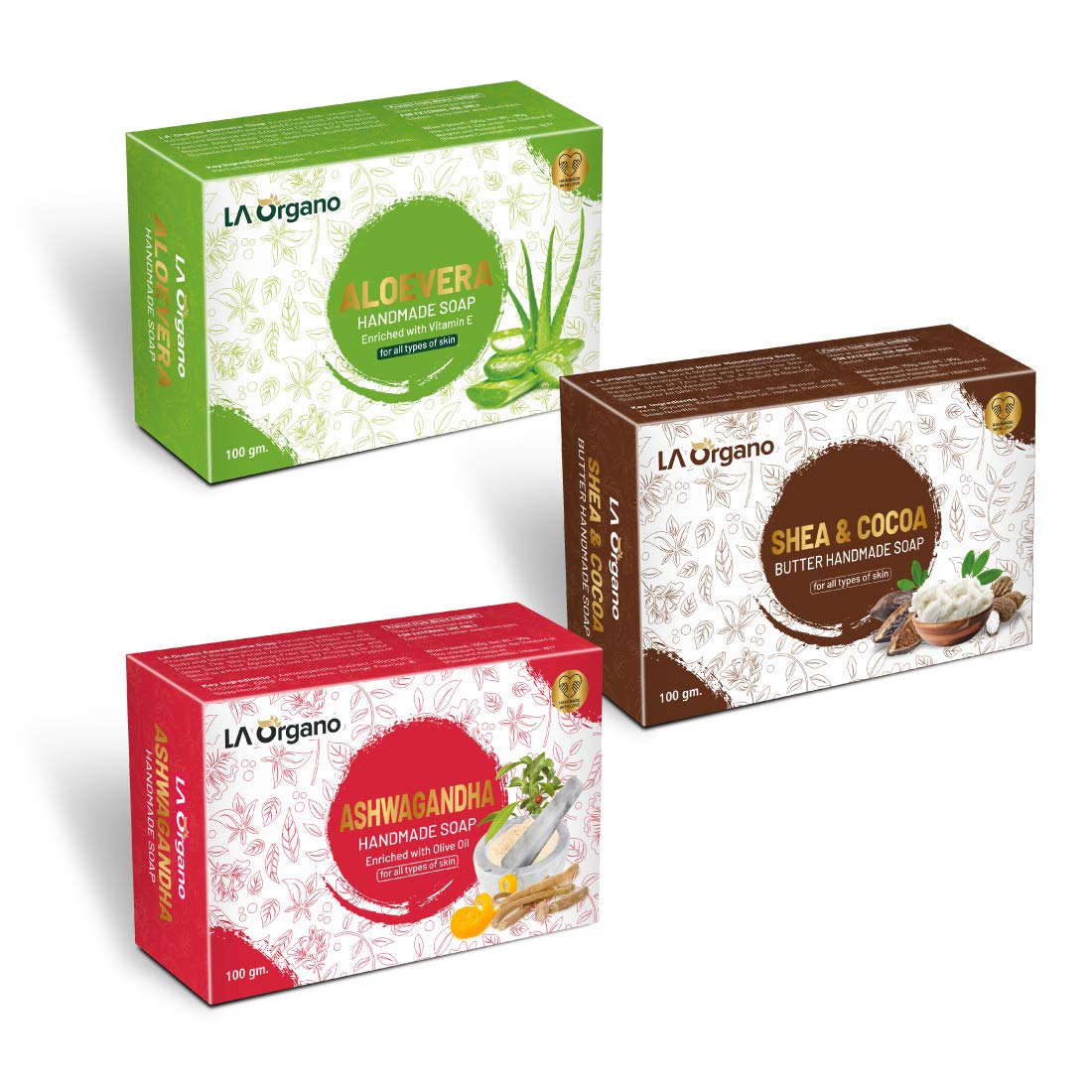 LA Organo Handmade Aloe Vera Shea Cocoa & Ashwagandha Bath Soap (100g each Pack Of 3)